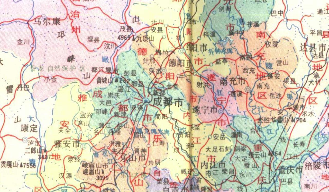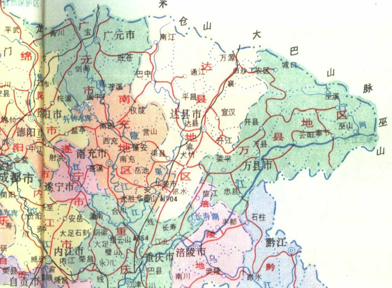 1988年的四川老地图 那个时候可真算得上是大四川了,面积57万平方公里,全国第五,人口超一亿。 当时的重庆是四川最大的城市,9区12县,第二是成都,5区12县。 第三应该算达县地区了,共有13个县市区, 巴中还是它的小弟,人口总量加起来还是不小的。