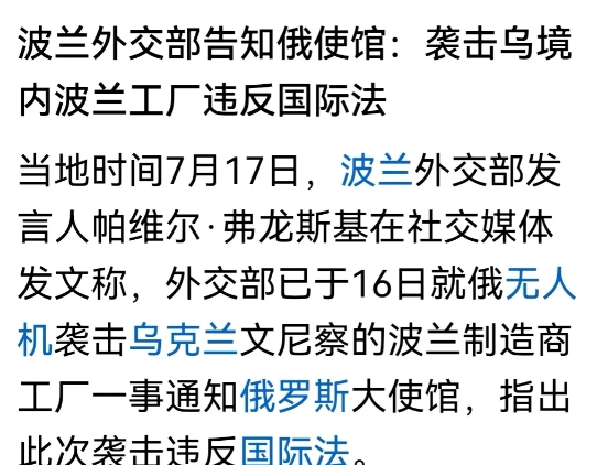 波兰严正警告俄罗斯!袭击乌克兰境内的波兰企业已触犯和违反国际法。波兰外交部门已通知俄罗斯驻波兰大使馆。 据媒体报道,波兰外交部于16日就俄罗斯无人机袭击乌克兰境内的波兰工厂一事通知俄罗斯大使馆,并严正指出俄罗斯的此次袭击行为已违反国际法。 据波兰外长西科尔斯基前一日透露,俄罗斯当日袭击乌克兰时导致波兰一驻乌生产商工厂7人受伤,损失惨重,预计恢复生产需要半年之久。 俄罗斯的袭击行为有没有违反国际法,虽然俄罗斯目前对此事尚无回应,但根据波兰与俄罗斯的恩怨情仇的历史可以看出,波兰这次以本国企业受损警告俄罗斯违反国际法是在明显有意将事态扩大化,从而达到吸引北约的眼球或者带动其他国家为本国驻乌企业遭袭一起谴责俄罗斯的目的。 战时的误伤、误炸以及不可控的有限波及无辜属于正常现象,俄罗斯违反不违反国际法需要经过公开且详尽的权威调查才能得出最终的结论。 而北约,以集体之力支持乌克兰对付俄罗斯,似乎已明显违反了国际法。 由此,波兰对俄罗斯违反国际法的警告就颇有些贼喊捉贼反咬一口倒打一耙颠倒黑白的嫌疑了。