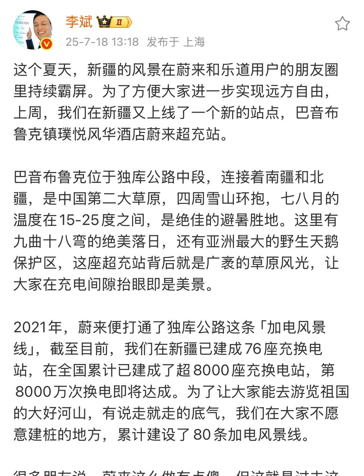 李斌: “很多朋友说,蔚来这么做有点傻,但这就是过去这么多年我们一直在做的傻事?” 就在刚才,李斌又给大家更新了他们的换电站,这次有点远,在新疆的巴音布鲁克,这个地方在独库公路的中间,一年就只开那么两三个月,剩下的时间都是冰天雪地,他在这个地方建换电站,从理论上来说,就是一件不回本的买卖! 但是,李斌他说他们就是在做傻事,他们之所以这样做,出发点很简单,就是为了让大家开电车哪儿都能去! 但这是真的有成本的,每一个换电站的投资都在百万以上,他这种不计回报的做法真的让用户刮目相看,让同行看不懂,但是他既然在坚持,就说明这个事情有他的道理吧!