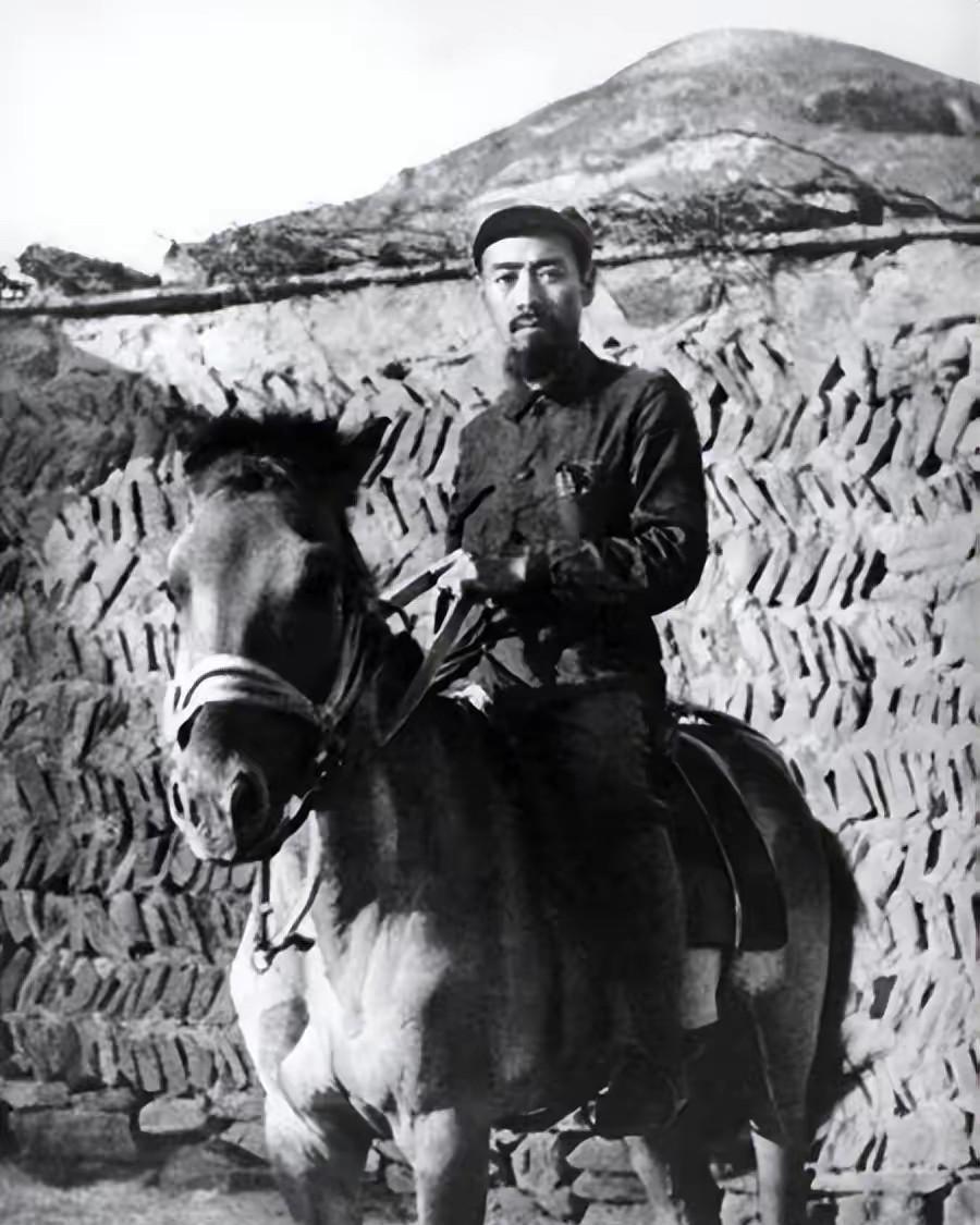 1935年,长征到达陕北的周恩来,骑着马、戴着帽子、蓄着胡子的照片。周恩来蓄胡子