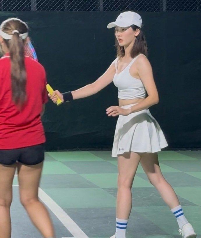 郑恺和老婆在晚上去打网球,苗苗露腰又露腿,身材太好了,而且皮肤好白,看起来状态真好。