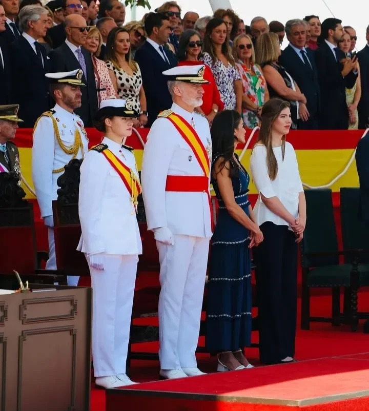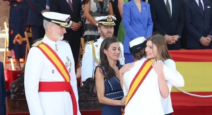 其实,就是西班牙的莱昂诺尔公主从海军学院毕业了,她老爸,也就是国王,给她颁了个海军大十字勋章。毕业典礼上,她穿着白色制服,看起来特别精神。她妹妹索菲亚也去了,姐妹俩还拥抱了一下,一家人其乐融融的。