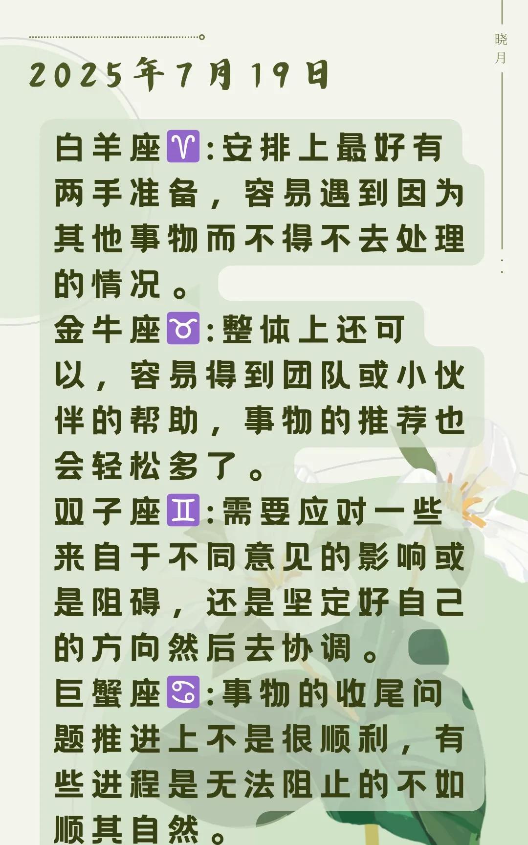 #分享城市新鲜事#【晓月】2025年07月19日十二星座运势,每日好运指引~根据太阳星座和上升星座看的。