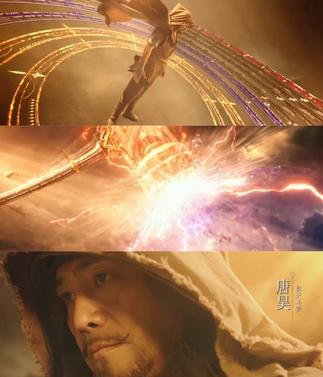 特效看得出还是花了钱的,可惜没有拍唐昊的昊天真身。昊天锤巨大化,狠狠的砸向比比东他们。虽然比不上动漫的特效炸裂,但比第一部扔昊天笋还是好太多了。