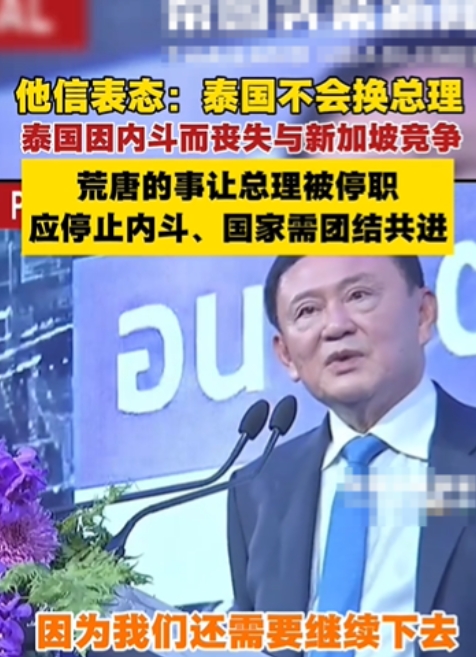 他信亲自为女儿站台,表示泰国不会换总理,也就是说,他信如此公开的表示,佩通坦将会继续担任总理,就意味着他信处理好了泰王和泰国军方的关系,佩通坦将会重返总理职位!他信在录音门事件以后,一直在公开地支持自己的女儿,一直在强烈的抨击柬埔寨方面,甚至他信已经表示,要彻底和洪森绝交。