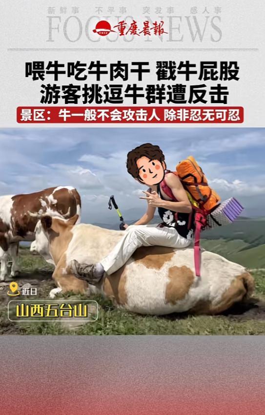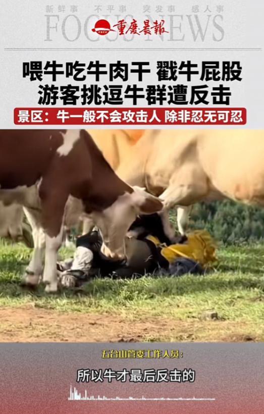 山西忻州,一男游客在景区游玩时,看见一群牛,他想恶搞一下,就掏出一包牛肉干喂牛嘴里,还用登山杆不停戳打牛的屁股 那牛起初嚼了两下牛肉干,突然就停下了,抬起头直勾勾地盯着他,旁边几头原本低头吃草的牛也慢慢围了过来,他还举着登山杆往牛屁股上敲了一下,说时迟那时快,最前面那头牛猛地一扬头,用角就把他顶得后退了两步,没等他站稳,后面的牛就冲上来,把他扑倒在地上,几头牛围着他用蹄子踩,他抱着头在地上滚来滚去,嘴里喊着 “别踩了别踩了”。 据重庆晨报 7 月 18 日报道,当时在场的游客赵阿姨说,她离得不远,亲眼看见那男的把牛肉干硬往牛嘴里塞,牛甩头不想吃,他还拽着牛尾巴笑,那登山杆戳得也挺狠,一下下的,听着都疼。 景区工作人员李师傅 19 号跟我们说,这些牛在景区里待了快十年了,都是附近村民散养的,平时跟游客井水不犯河水,孩子们过去摸它们的背,它们都懒得动,这次真是奇了怪了,后来调了附近的监控,才看见是那男的先动手的。 那男的被救起来的时候,裤子都被踩破了,膝盖上划了道大口子,胳膊上也青一块紫一块的,旁边卖水的摊主王大哥说,是几个年轻小伙拿着木棍把牛赶开的,不然还不知道要被踩成啥样,他被扶起来的时候还骂骂咧咧的,说 “这些畜牲敢跟我较劲”。 当地派出所的民警也来了,问了旁边几个游客经过,还拍了他身上的伤,民警小李说,这事儿得看具体情况,要是游客故意挑衅,那责任可能得他自己担着,要是牛的主人没看好牛,也可能有点责任,但现在还说不准。 资料显示,《民法典》里有规定,要是被侵权的人自己故意找事,动物的主人可能就不用赔钱了,不过景区方面说,这些牛虽然在景区活动,但不属于景区管理,是村民自己放养的,所以景区的责任可能不大。 那男的后来被朋友送到了忻州第二医院,医生说他就是皮外伤,骨头没啥事,缝了几针,输两天液就能走,他朋友跟医生说,当时就是觉得好玩,哪想到牛这么大脾气。 也有人说,其实那牛一开始只是摆尾巴,像是在警告,那男的不光没停,还从包里又掏出一块牛肉干,往牛鼻子上凑,说 “闻闻,香不香”,这才彻底把牛惹火了,不过这话是谁说的,也没人认,就当个闲话听。 景区办公室的刘大姐说,他们已经在景区入口处贴了新的告示,让游客别随便喂动物,更别打骂它们,还加派了几个巡逻的,看见有人逗牛就赶紧劝,免得再出这种事。 信息来源:本文综合自重庆晨报 7 月 18 日公开报道 目前那男的还在医院住着,民警说等他伤好点了再做笔录,牛的主人是附近村里的老杨,他说自己的牛从来没伤过人,这次肯定是那游客太过分,至于赔偿的事,他暂时不想谈 事件仍在进一步处理中。