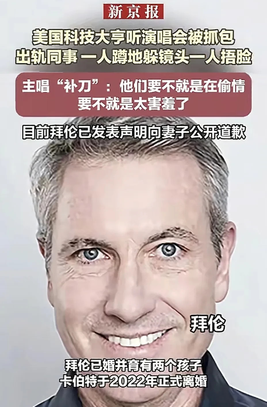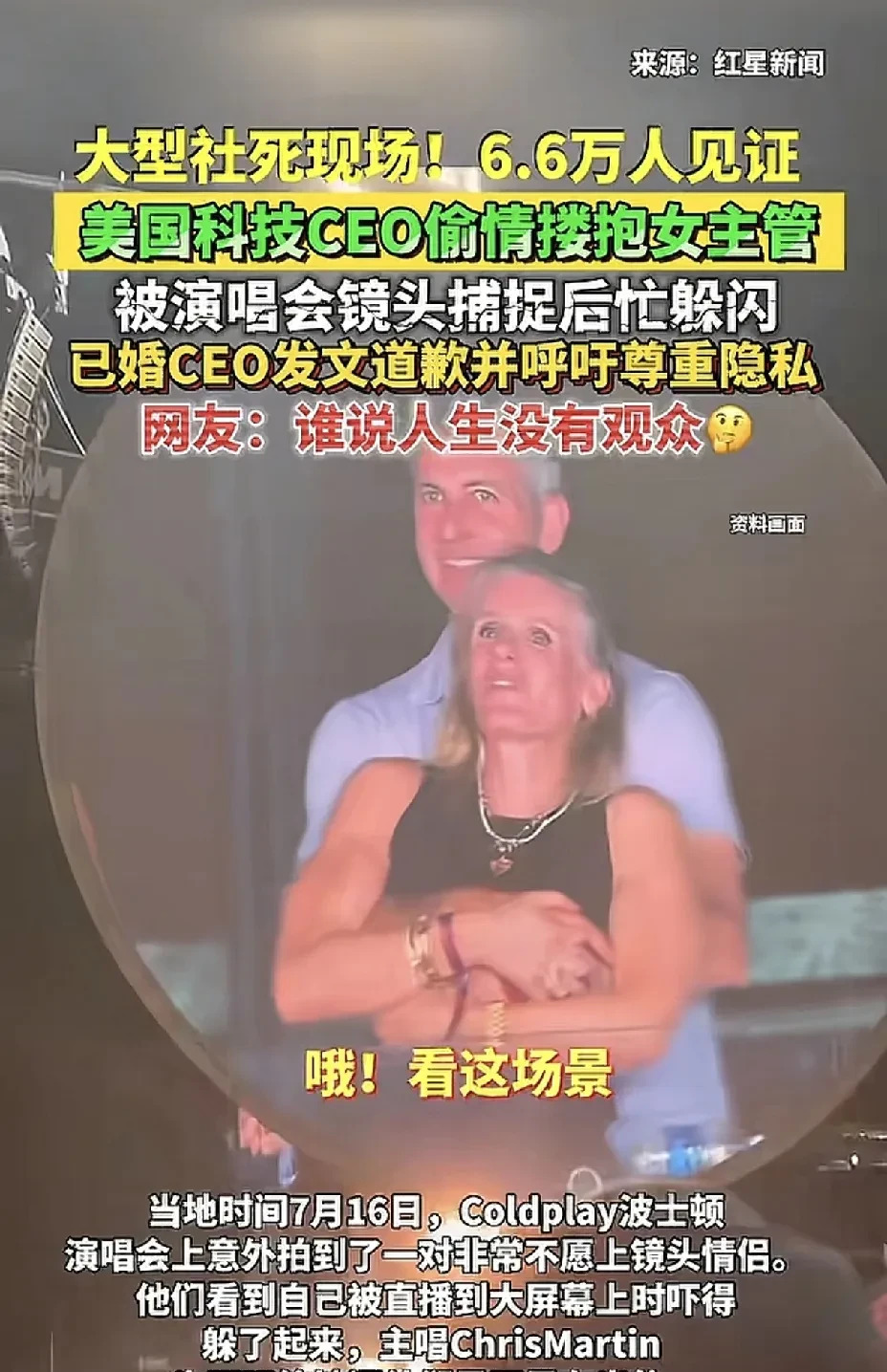 话说这个CEO,名叫拜伦,是一家IT公司的老大,家里还有俩娃。而他搂着的那个女人,是公司的人力总监,名叫卡伯特,是个离异女性。俩人偷偷摸摸去看演唱会,本想低调,结果被大屏幕来了个特写。这下好了,全世界都知道了!