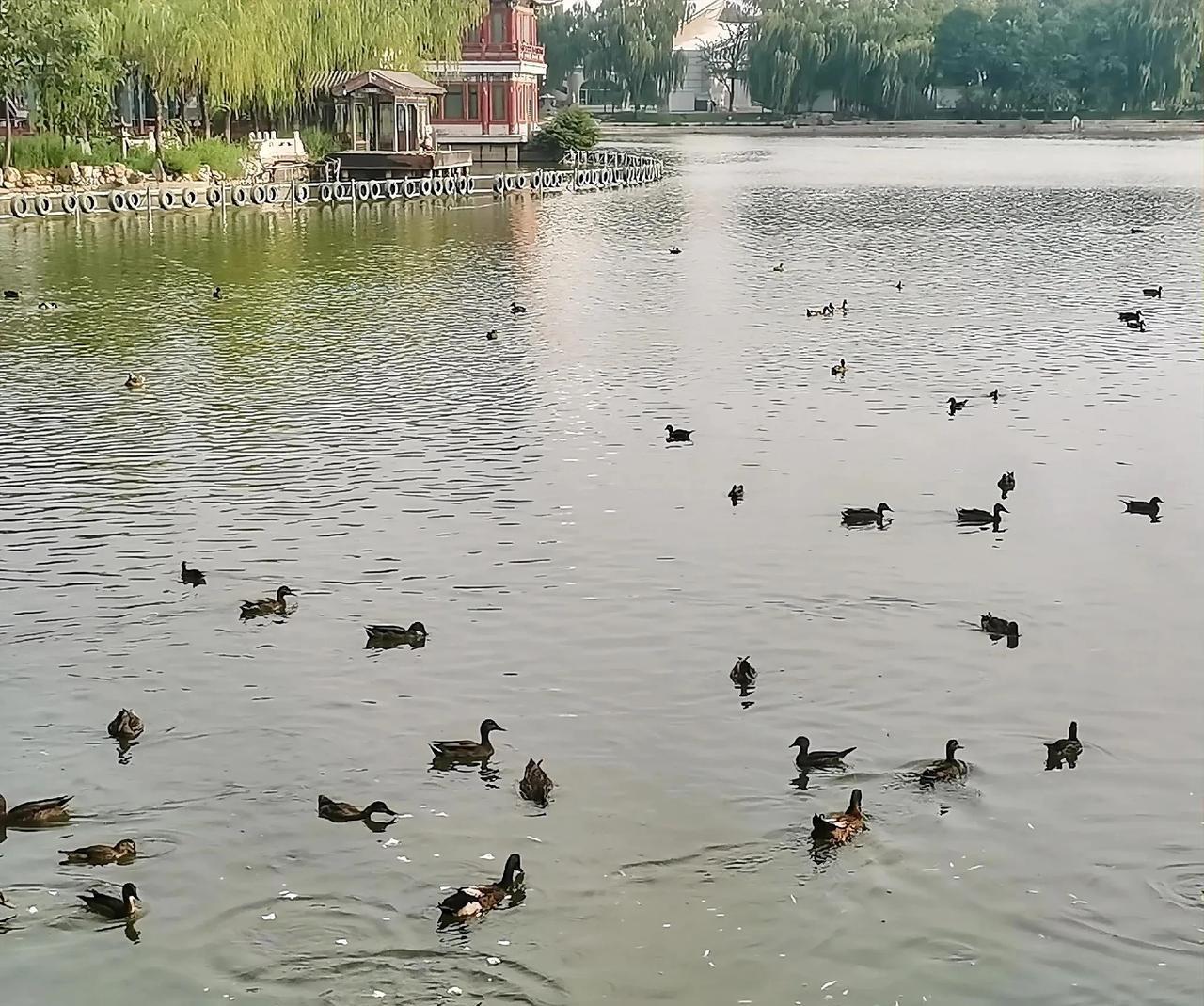 早晨到公园里玩儿,走在湖边,柳树枝条随风飘荡,微风轻轻的吹着很是凉爽舒适。 走了一会儿,就有点热,看到公园湖中心的亭子上,坐着很多人。 我们也走过去坐在亭子的凳子上,休息了一会儿。 坐在亭子的凳子上,微风吹着,真是太舒服了。 在亭子里能观赏到荷花池里盛开的荷花,还能看到很多鸭子。 有一个大姐在喂鸭子,鸭子一边吃着大姐喂投的东西,一边在水里嬉戏游玩儿。 亭子里还坐着很多上年纪的老人,他们高兴的聊着天,享受着晚年的幸福时光。