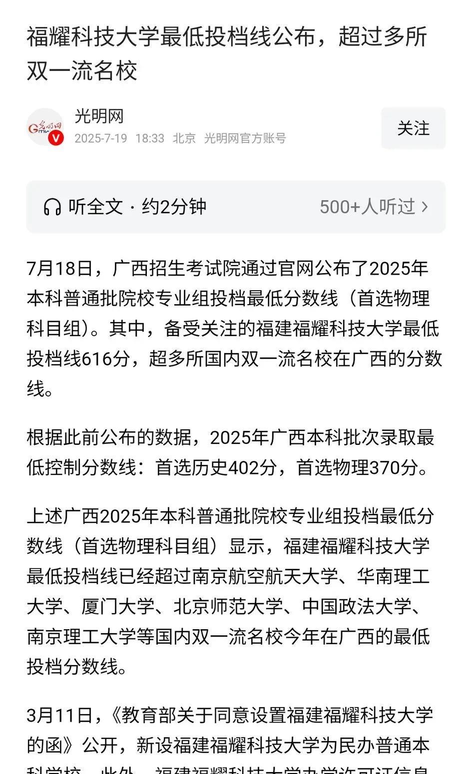福耀科技大学和大湾区大学这两所今年首次招生的大学,最低投档分都超过了600分,超