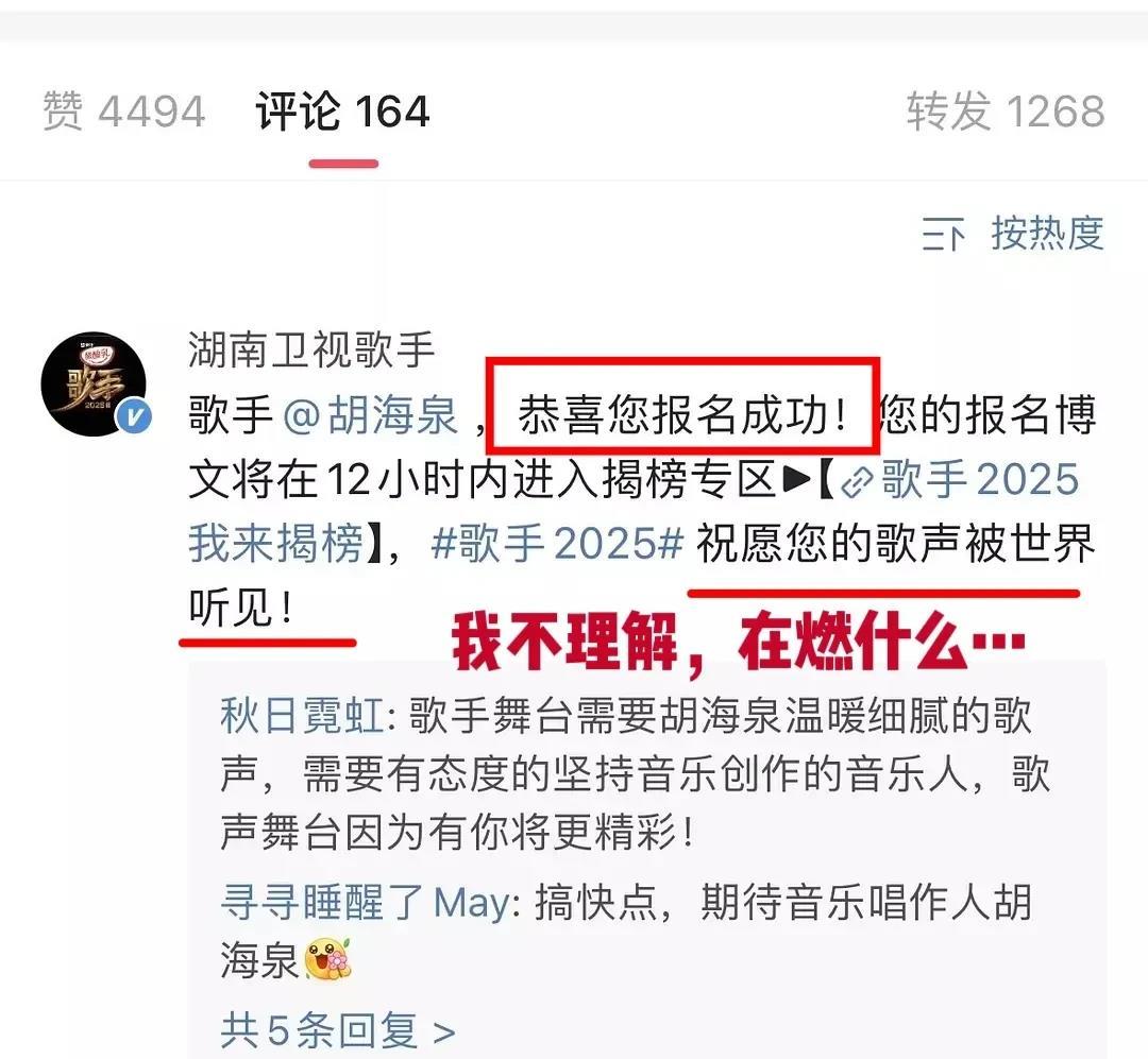 既然如此,那我就支持胡海泉再拿一次歌王了。 歌手这个节目是不是已经疯了? 演都不演了是吗,胡海泉这个临时报名是在干什么啊太讽刺了吧! 这真的是对所有报名揭榜歌手的不尊重, 多出来这一期揭榜有什么必要吗? 谁爱看半个羽泉来揭榜啊…… 芒果的回复简直就是自我感动,到底在燃什么,在感动什么。