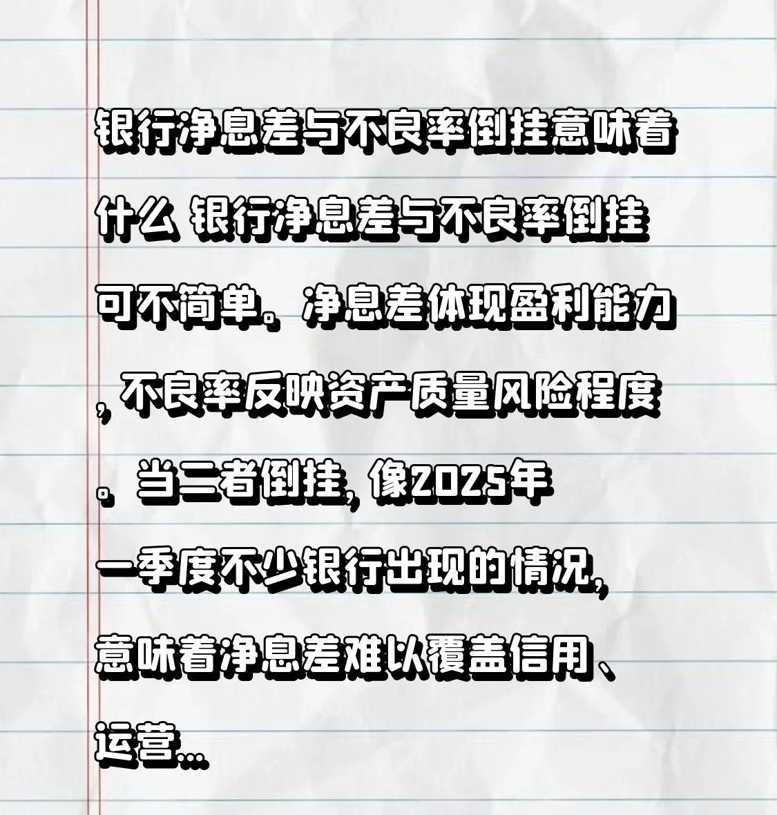 银行净息差与不良率倒挂意味着什么 银行净息差与不良率倒挂是何意呢?银行净息差与不良率倒挂到底意味着什么呢?这可不是小事一桩。要晓得,净息差可是展现银行盈利能力的重要指标,而不良率则体现着资产质量的风险状况。 当二者出现倒挂的情形时,就如同2025年一季度众多银行所遭遇的那般,这表明净息差已经无法覆盖信用、运营以及资本这三项成本了。就拿农商行来讲,其不良贷款率达到了2.86%,然而净息差却仅有1.58%。这对银行业而言,无疑是个巨大的难题,银行的可持续发展也因此遭受阻碍。 从数据的角度看,不同类型的银行情况也各有不同。其中民营银行的表现最为优异,不良率为1.76%,净息差达到了3.95%。这种倒挂现象在银行业还是头一遭呢。随着半年报披露日期的日益临近,银行业绩究竟如何备受众人关注。毕竟这关系到银行未来的发展走向,还有应对风险的能力等诸多方面的问题。 #银行利率# #银行收入差距# #存款负利率# #信用社利息利率# #银行利率变局#