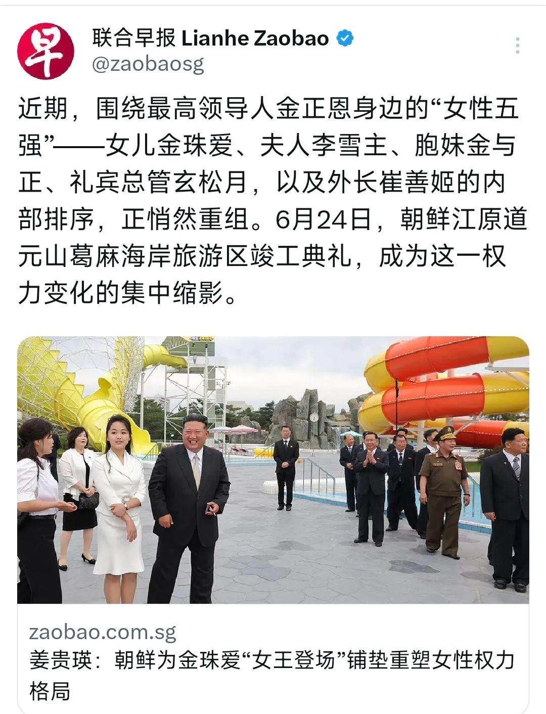 新加坡联合早报今天(7月21日)写道:“近期,围绕最高领导人金正恩身边的‘女性五强’——女儿金珠爱、夫人李雪主、胞妹金与正、礼宾总管玄松月,以及外长崔善姬的内部排序,正悄然重组。6月24日,朝鲜江原道元山葛麻海岸旅游区竣工典礼,成为这一权力变化的集中缩影。”