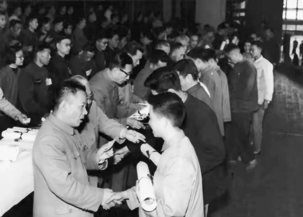 1964年,时任上海市委书记陈丕显同志(二排左一)与上海市政府市长曹荻秋同志(二排左二),上海市政府副市长刘述周同志(二排左三),上海市委组织部部长王一平同志(二排左四)等领导在大会主席台上给先进集体和获奖职工授奖时的照片。