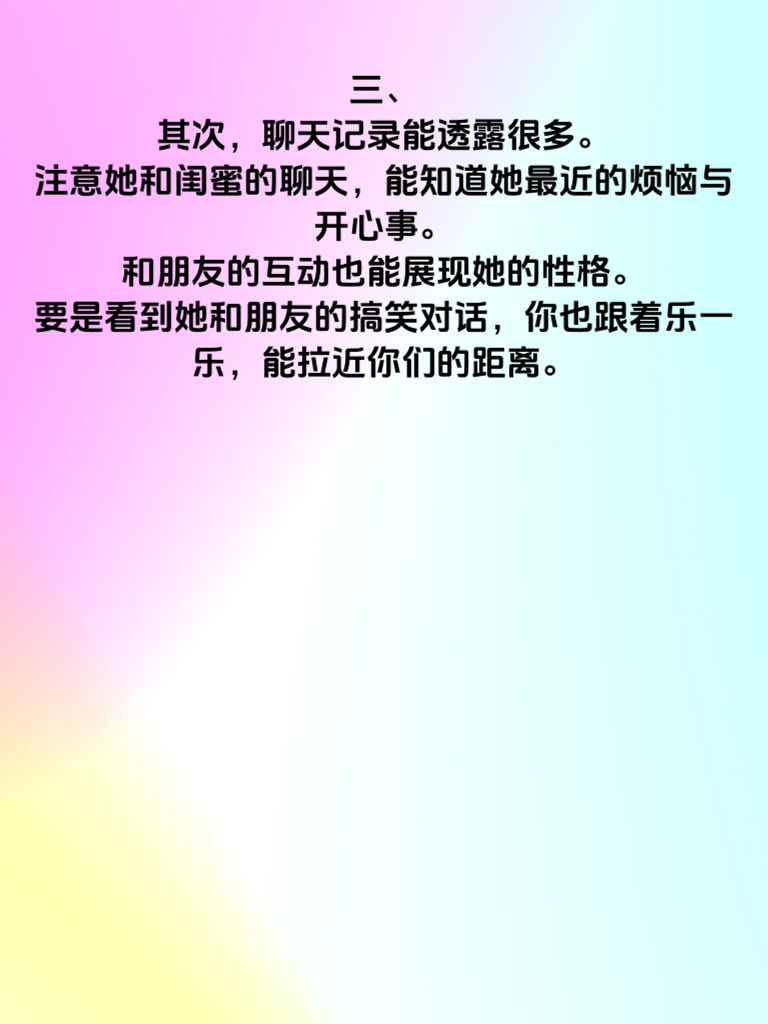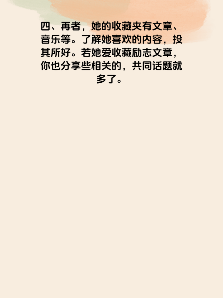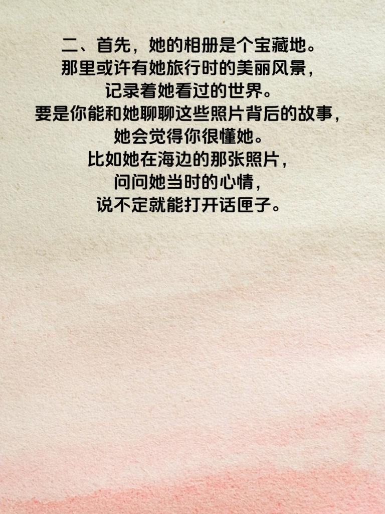 一、手机,在现代生活里,早已不只是个通讯工具,对很多女生而言,它藏着无数小心思。想走进她的心,先从了解她手机里的秘密开始。 二、首先,她的相册是个宝藏地。那里或许有她旅行时的美丽风景,记录着她看过的世界。要是你能和她聊聊这些照片背后的故事,她会觉得你很懂她。比如她在海边的那张照片,问问她当时的心情,说不定就能打开话匣子。 三、其次,聊天记录能透露很多。注意她和闺蜜的聊天,能知道她最近的烦恼与开心事。和朋友的互动也能展现她的性格。要是看到她和朋友的搞笑对话,你也跟着乐一乐,能拉近你们的距离。 四、再者,她的收藏夹有文章、音乐等。了解她喜欢的内容,投其所好。若她爱收藏励志文章,你也分享些相关的,共同话题就多了。 五、最后,她的应用列表藏着兴趣。看她常用的软件,是爱拍照修图,还是沉迷阅读。知道这些,追求她时就能更精准地找到话题,让她感受到你的用心,离她的心也就更近一步啦。