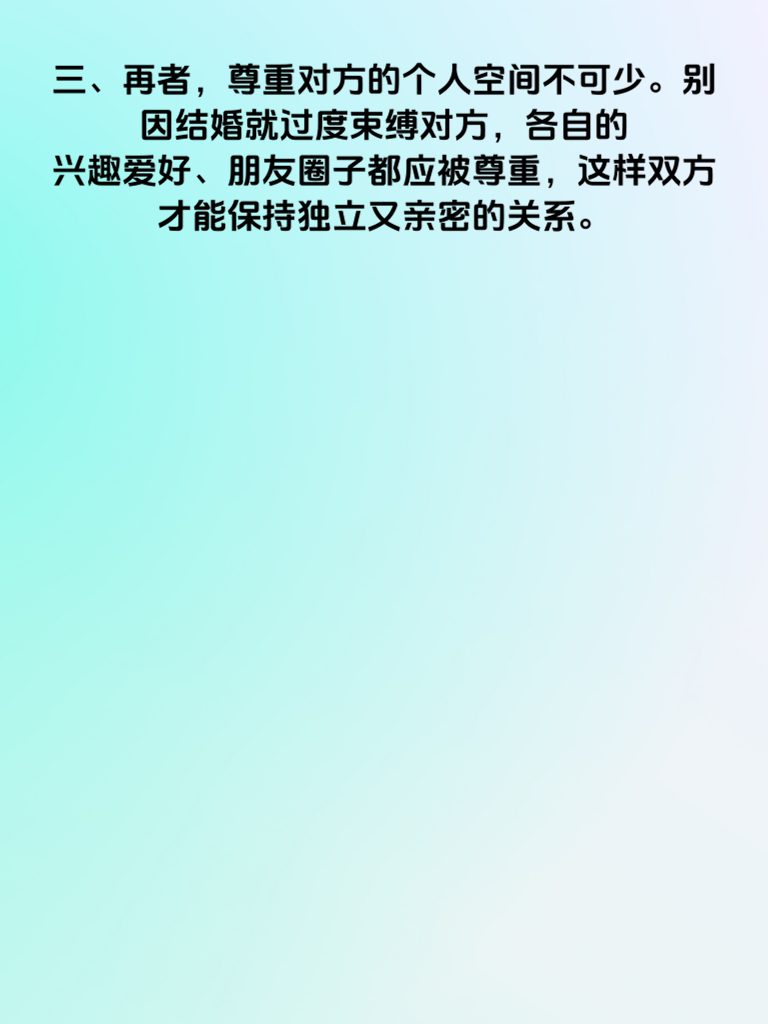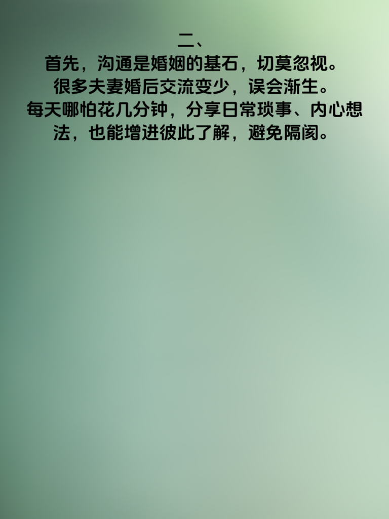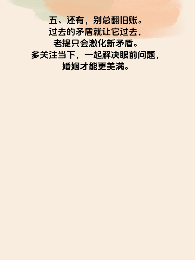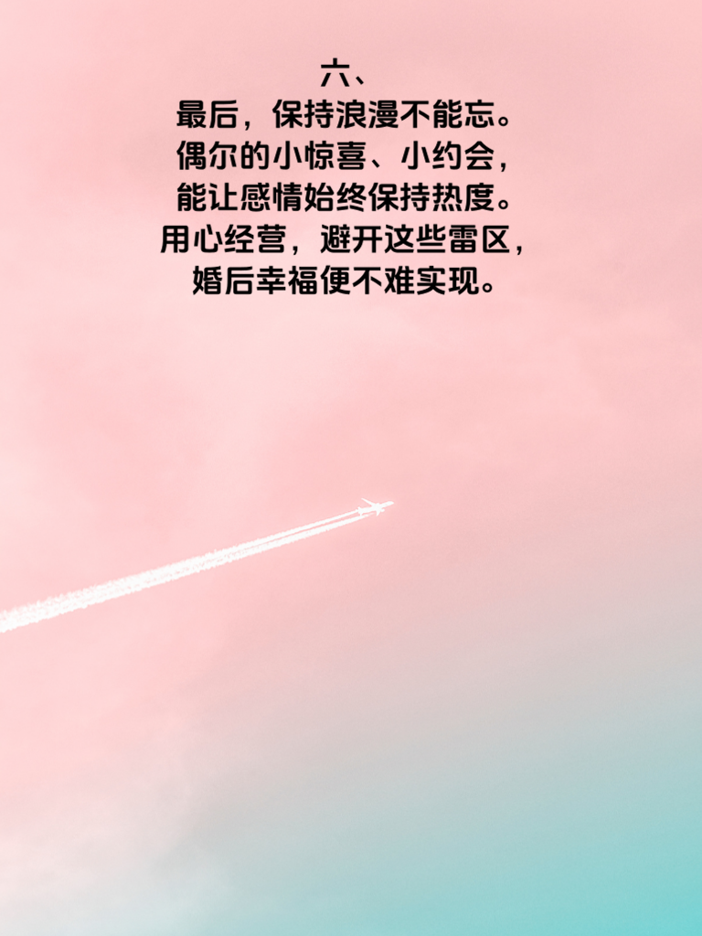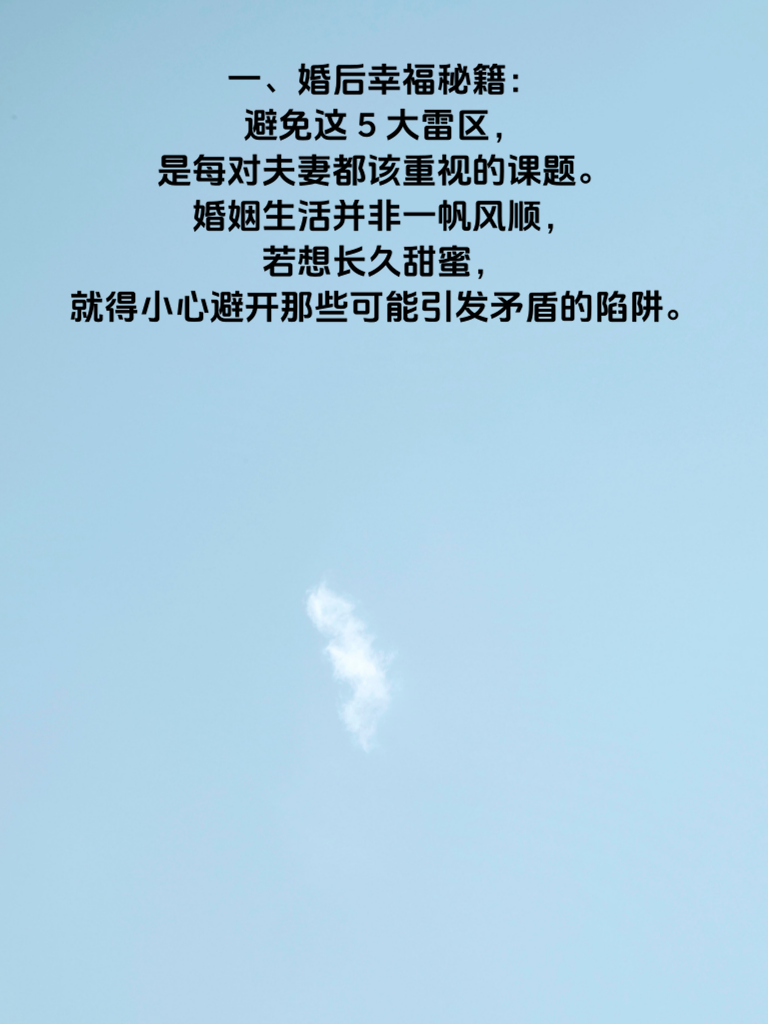 一、婚后幸福秘籍:避免这5大雷区,是每对夫妻都该重视的课题。婚姻生活并非一帆风顺,若想长久甜蜜,就得小心避开那些可能引发矛盾的陷阱。 二、首先,沟通是婚姻的基石,切莫忽视。很多夫妻婚后交流变少,误会渐生。每天哪怕花几分钟,分享日常琐事、内心想法,也能增进彼此了解,避免隔阂。 三、再者,尊重对方的个人空间不可少。别因结婚就过度束缚对方,各自的兴趣爱好、朋友圈子都应被尊重,这样双方才能保持独立又亲密的关系。 四、经济问题也常是雷区。夫妻最好开诚布公地商量财务规划,明确支出、储蓄等事宜,避免因钱生不必要的气。 五、还有,别总翻旧账。过去的矛盾就让它过去,老提只会激化新矛盾。多关注当下,一起解决眼前问题,婚姻才能更美满。 六、最后,保持浪漫不能忘。偶尔的小惊喜、小约会,能让感情始终保持热度。用心经营,避开这些雷区,婚后幸福便不难实现。