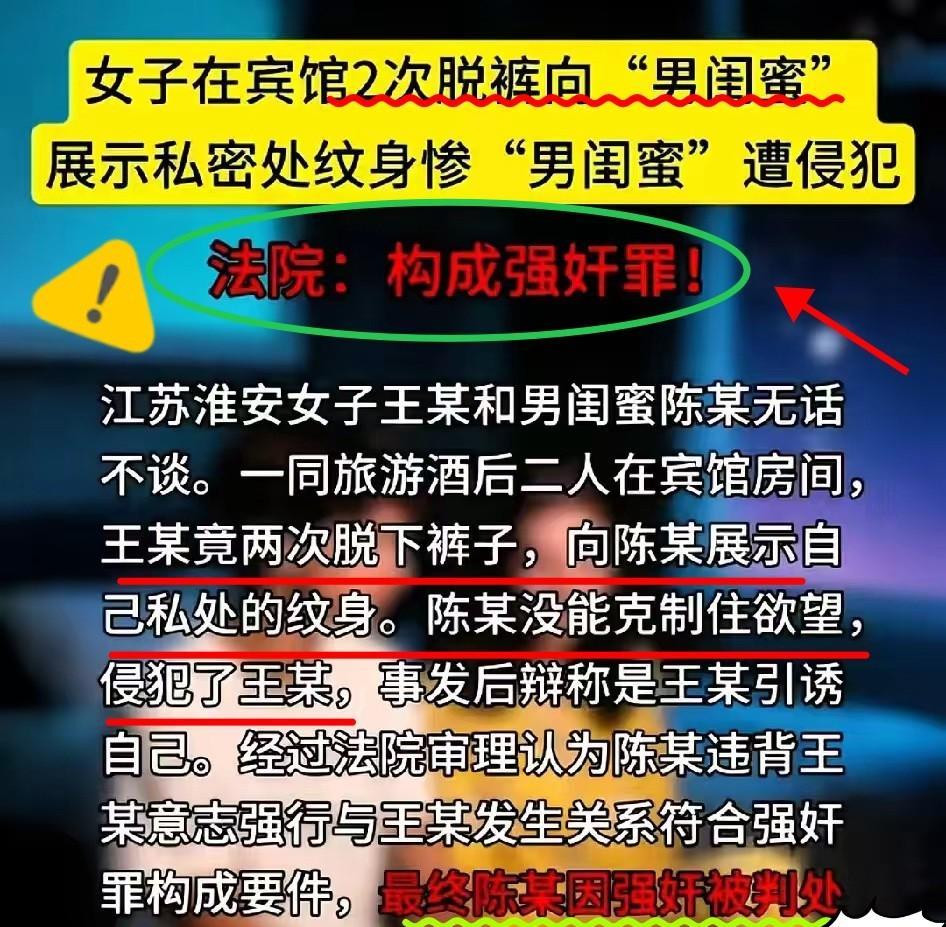 真是林子大了什么事都有! 一女的在宾馆两次给男闺蜜展示私处纹身, 男的没忍住犯错,结果 被判三年! 这女的真是没搞清楚异性之间的界限,男的也管不住下半身。但把错全推给纹身就离谱,纹身就是个图案,坏的是人心。 异性相处,必须有分寸,所谓“男闺蜜”,没了分寸感就是个雷。 不是说不能有异性朋友,而是要“止乎礼”,别借着闺蜜之名瞎搞。 你觉得异性之间,真的存在纯友谊吗? 那这条友谊的线该怎么划才不越界?