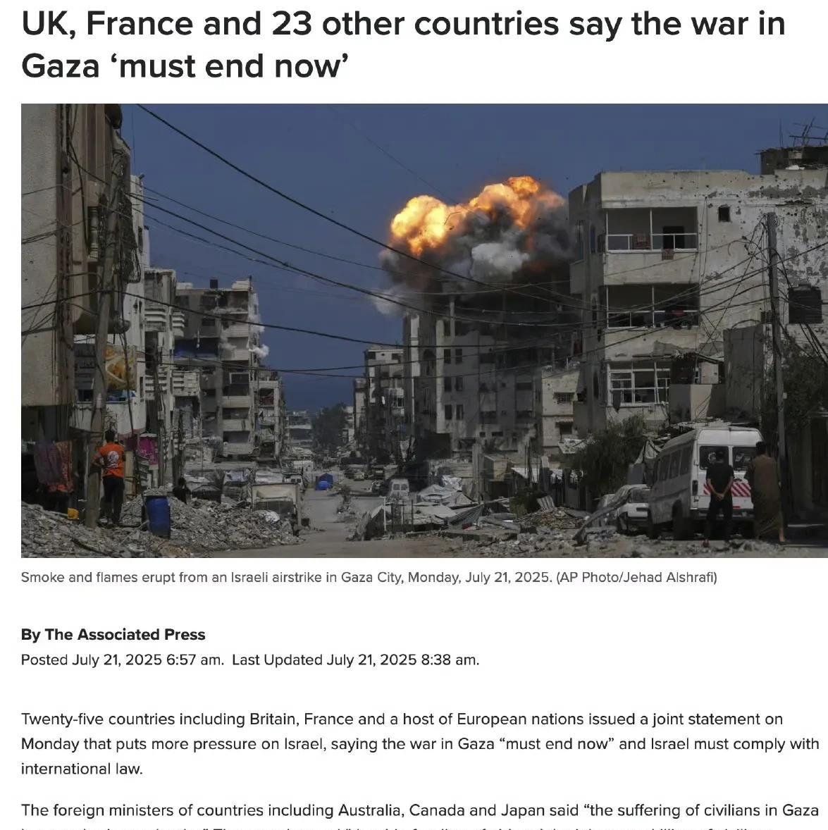 澳大利亚、加拿大和日本三国外长谴责以色列对约旦河西岸教堂的袭击事件,同时他们表示—— “加沙平民的苦难已达到前所未有的深度”。谴责“援助物资零星发放,以及为满足水和食物等最基本需求而对包括儿童在内的平民实施非人道杀害”。 以色列几乎每天都在宣传对加沙地区的人道主义援助,送去多少物资,多少餐食,以此掩盖真相。 刚刚发布的以色列官方消息称,“以色列不到两个月的时间,已向加沙的巴勒斯坦人民送去了超过8000万份餐食。 我们的行动环境瞬息万变且复杂,我们不断调整,以维护我们的核心原则: 中立、人道、独立和公正。” 多么动听! 据半岛电视台报道,以色列在加沙地带运营的食物分发点已经被联合国定义为“死亡陷阱”,加沙地带的每一块面包都带着风险,“对加沙民众来说,获得帮助的幻想比饥饿本身更加危险”。 这就是真相!