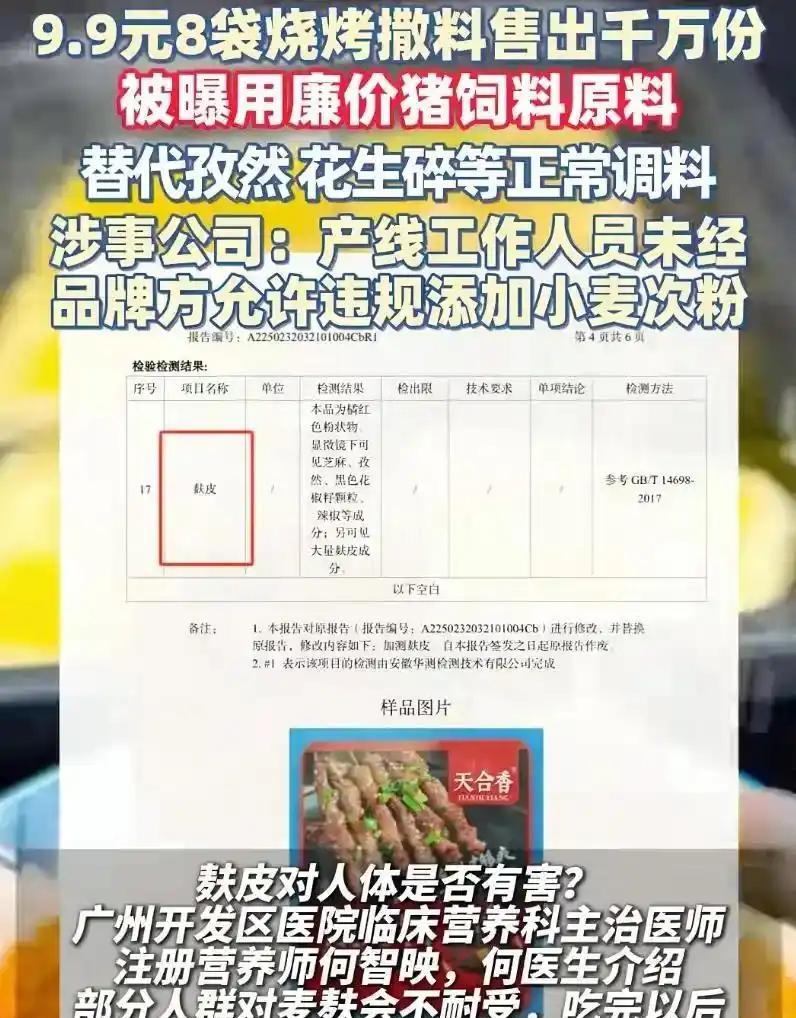 猪吃饲料,我们吃猪肉,现在直接绕开中间商,进化成直接吃饲料了么! 夏天是吃烧烤的季节,各种美味的烤肉成为了大家的最爱,但是外面的烧烤不仅贵,还可能不卫生,所以大家为了省钱健康,就选择在家烧烤。毕竟现在的烧烤料很方便,味道也很好吃,关键便宜,10块钱就能买十几包。 可任谁也没想到,烧烤料居然塌房了,某些烧烤料中居然检测出了使用了廉价的麸皮、稻壳等猪饲料原料,代替原本的花生、孜然等调料。要是烧烤料味道差,仅仅只是技术问题,但掺杂了这些已经黑心商家了。 当事情曝光后,所谓的商家还狡辩说,生产线工作人员未经允许添加了违规小麦次粉。这个解释太可笑了,员工凭啥要添加,他图啥?图能多分他们钱吗?另外一个生产线员工能随意改销量百万的烧烤配方吗?这纯粹就是在甩锅。 有网友说麦麸比添加剂好多了,很多面包里就有,但需要明白的是,有些人会对小麦过敏,或者麸质不耐受的人来说,这包调料就是一剂过敏原。另外麦麸可能会加在一些面包里,增加蓬松感,烧烤料需要蓬松吗? 所以说配料表真的没有实质上的意义,该掺假一样掺假,人家不写我们也没办法!