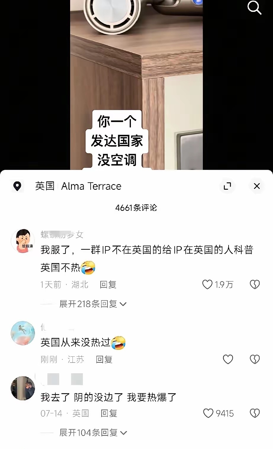 结果评论区一群人进行科普:英国又不热、欧洲都不热的,根本不需要空调。