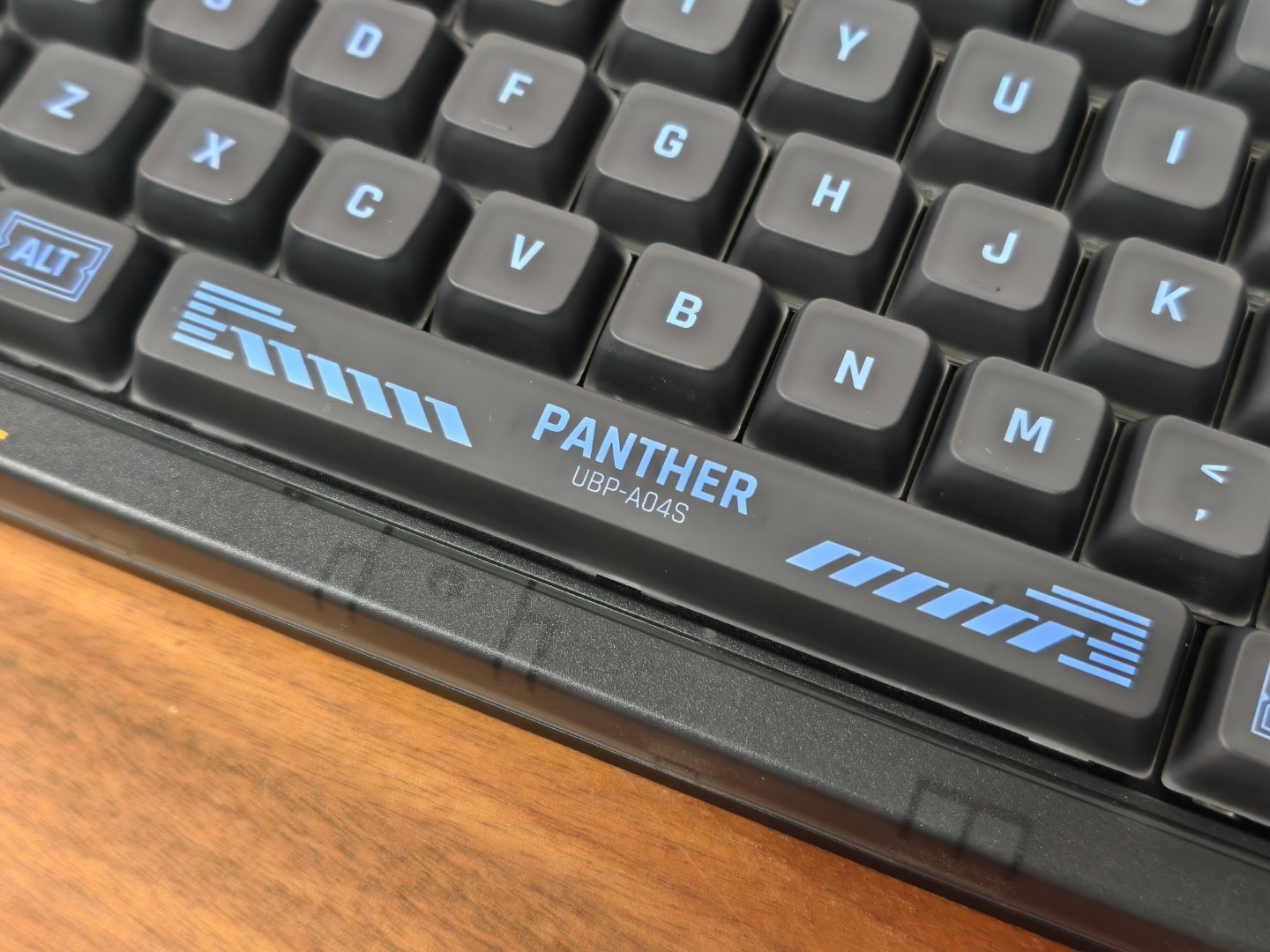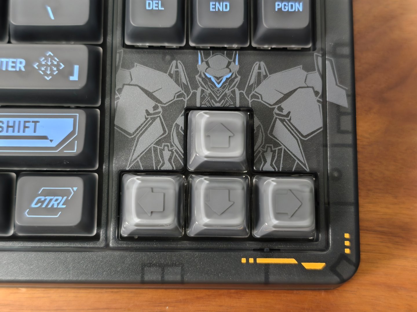 一、从游戏里 "拆" 下来的机甲 第一眼望去,像从《解限机》拽出迷你黑豹机甲。 哑光黑机身如战场洗礼后的装甲,正上方是黑豹离子炮缩微复刻,边缘金属感带余温。方向键简笔画勾勒机甲骨架,按下去像输入指令。 键帽细节拉满:SHIFT 键和回车键是黑豹热能刃造型,按动如拔刀;ESC 键复刻机甲头部,棱角比游戏建模带感。水晶半透明键帽配 8 种 RGB 灯效,按键可自定义颜色,搭配机械旋钮,深夜亮灯时,桌面秒变机甲格纳库。