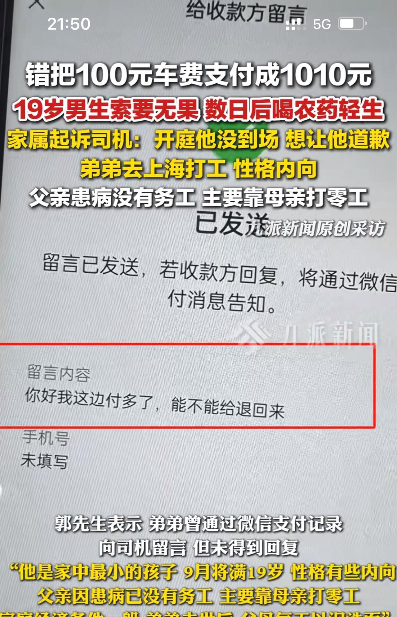 现在全网闹心的 就是上海这个不退钱的司机了! 他不是害怕这家人问他要孩子自 杀的赔偿,而是害怕网友把他扒出来! 男孩本想在上海打拼,那多付的钱可能是他珍贵的启动资金,是希望。可司机的冷漠,就像一盆冷水,浇灭了他对这个城市的信任。最后男孩自杀,司机躲躲藏藏,甚至不敢出庭,他到底在怕什么? 这司机缺失的是最基本的道德和良心。这不是一笔小钱,这关乎一个少年的希望和尊严。如果当 时司机能将心比心,及时退钱,这场悲剧或许就能避免。