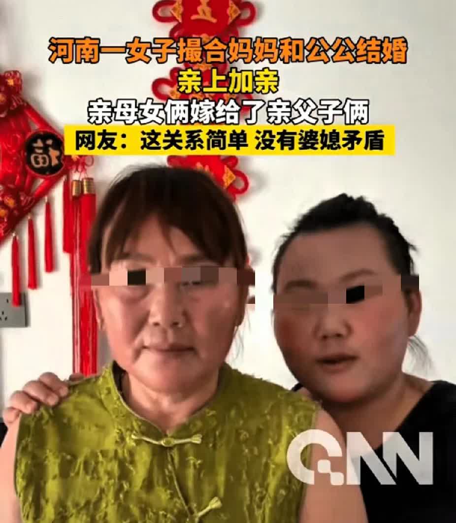 “彻底乱套了!” 河南周口这事儿,听着像段子居然是真的! 媳妇把亲妈嫁给了公公,母女俩嫁给父子俩,这关系听着绕,人家倒过得热热闹闹。 你说怪不怪?女子妈离婚多年,公公丧妻单身,她一合计,干脆让俩老人搭个伴。丈夫、公公、亲妈全点头,新家庭就这么成了。网友笑说“没婆媳矛盾了”,倒也是,亲妈变婆婆,哪还有隔夜仇? 其实啊,这事儿看着稀奇,内核特简单:老人有个伴,年轻人少操心,一家人求个安稳。至于孩子咋称呼?人家自个儿定的规矩,舒服就行。 换作是你,身边要是有这种事,你会咋看?
