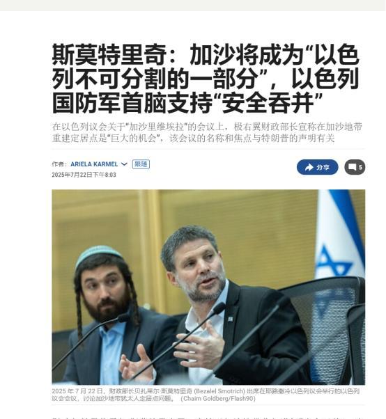 以色列财长:我们将占领加沙,使它成为以色列不可分割的一部分 近日,以色列极右翼财政部长比撒列·斯莫特里赫,在以色列议会举行的题为“加沙里维埃拉——从愿景到现实”的会议上表示,以色列应当占领加沙,使之成为领土不可分割的一部分。 他的原话是这么说的:“我们将占领加沙,使其成为以色列不可分割的一部分。美国总统(川普)批准我们把加沙地带变成繁荣的地带,一个提供就业机会的度假小镇。这才是实现和平的方式。所以,把加沙人迁移到其他国家的计划,将成为促进加沙地带定居的一种手段。我们可以从北部边境开始,在那里建立三个社区,解决我们的住房问题和住房成本。” 好家伙,这回是连装都懒得装了呗?