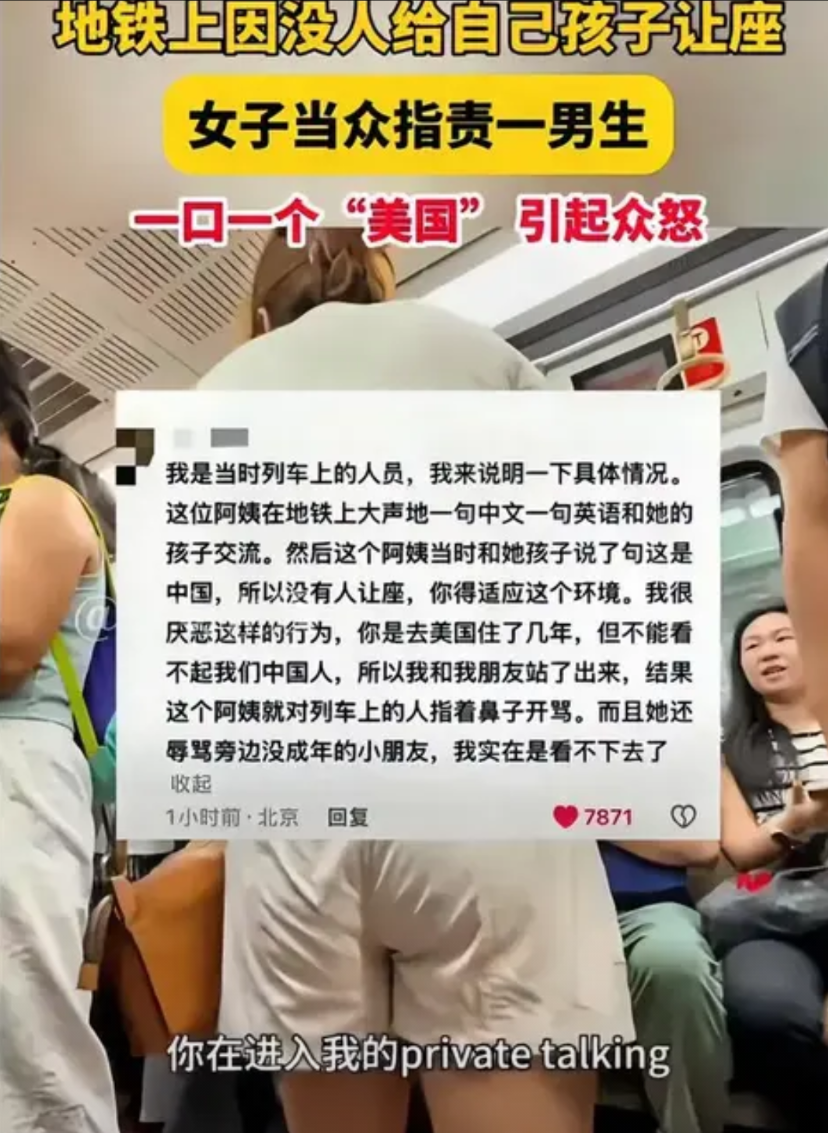 又一“殖人”大姐火了!北京地铁,一位大妈因无人给她让座,便怒喷全体中国人,一口一个美国多好,一口一个中国素质低,列车员都看不下去了! 7月24号那天,北京地铁正是早晚高峰最挤的时候,车厢里人挨人、人贴人,大家都盼着赶紧到站松口气。 就在这样的拥挤里,一位带着孩子的大妈站在车厢中间,周围座位上的人要么低头看手机,要么闭目养神,没人主动站起来给她和孩子让座。 这本是高峰时段地铁里常见的场景,毕竟大家上班上学都累,能坐着歇会儿谁也不想动。 可这位大妈不这么想,她先是拉着孩子,用一句中文一句英文的方式念叨:“这是中国,所以没人让座,你得适应这环境。” 那音量不大不小,刚好能让周围乘客都听见,明摆着是借教育孩子在指责旁人。 旁边几个年轻小伙听着不舒服了,其中有人在美国留过学,直接开口说让座是自愿的,不能道德绑架,更不能觉得在国外待过就高人一等。 这话彻底点燃了大妈的火气,她立刻冲着小伙嚷嚷起来,还特意提了一句“你在美国留学四年,不让座也就罢了,还在这儿瞎BB”,明显带着对留学生身份的针对性攻击。 见周围人都看过来,她更来劲了,站在那儿滔滔不绝地说国人素质低,说在美国只要有老人小孩,肯定有人主动让座,公共场合大家都客客气气,不像国内这么冷漠。 有乘客反驳说公共场合大声喧哗、道德绑架在哪儿都不合适,她却梗着脖子说“美国不会有这种情况”。 后来有位大哥实在听不下去,说了句“你这么喜欢美国,适合在那儿生活”,没想到大妈没听出是嘲讽,反倒得意地说自己确实不在这儿常住,还当场炫耀起半英半中的说话方式。 网友听后立刻笑出了声,原来,大妈说的都是些小学水平的英语,却搞得像多高级似的。 不过更让人不舒服的是,一位未成年小孩忍不住说“你不配当中国人”,她立马掏出手机要报警,嘴里还骂骂咧咧地说周围人是“SB”。 地铁乘务员过来劝了好几次,她根本不听,逮着谁都要念叨几句。 说起来也挺矛盾的,这位大妈把美国夸得像天堂,说那儿的地铁人人讲素质,可实际上常去美国的人都知道,纽约地铁里老鼠乱窜、站台有异味是常有的事,哪有她说的那么完美? 她一边贬低国内“冷漠”,一边自己在公共场合大声辱骂别人,一边说美国“有礼貌”,一边对旁人的劝阻充耳不闻。 更让人不解的是,她嘴上说美国好,却选择回到中国生活,被人劝“去美国住”还以为是好话,这种对崇洋言论的盲目认同实在让人费解。 甚至有人表示,大妈一看就是没有去过美国的人,对美国印象,完全是“读者”、“意林”式的印象。 而最让人担心的是她对孩子的影响,大妈当着孩子的面一口一个“中国不好、美国好”,灌输这种崇洋媚外的想法,很可能让孩子从小就觉得外国啥都好,自己的国家处处不如人。 久而久之,孩子可能会失去对国家的认同感,形成扭曲的价值观,这可不是小事。 家长本应教孩子尊重他人、体谅他人,她却用自己的情绪失控和错误认知给孩子做了坏榜样。 如今事件传到网上后,网友们更是炸开了锅。 有人说“美国那么好,你倒是去啊,别在中国地铁上指手画脚”。 有人嘲讽她“纽约地铁的老鼠给你让座吗?尿骚味的站台让你觉得有礼貌?”。 还有人支持视频不打码,觉得就该让这种行为被大家看到,起到警示作用。 大家愤怒的不只是她逼着别人让座,更是她那种崇洋媚外、贬低自己国家的态度。 其实,每个国家都有自己的优点和不足,美国不是天堂,中国也不是她说的那样“冷漠”。 我们承认发展中还有进步空间,但更该看到这些年国家在公共服务、社会文明等方面的飞速发展。 要引导大家树立正确的国家观和民族观,就得从身边事做起:家长要教孩子客观看待中外差异,既不盲目自大,也不妄自菲薄。 学校和社会要多宣传身边的文明故事,让大家看到国人的善良和担当,遇到这种崇洋媚外的言论,也该理性反驳,让更多人明白,尊重自己的国家和同胞,才是真正有素质的体现。 让座本是小事,可一旦扯上崇洋贬己,就触碰了大家心里的底线,这大概就是这场争议最值得反思的地方。