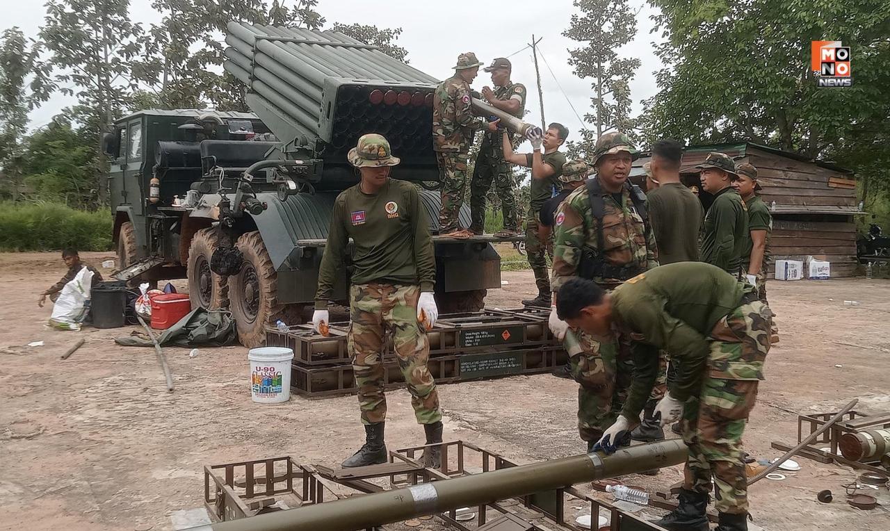柬埔寨皇家陆军在柬泰边境附近装填122毫米火箭炮弹。图一、二为中国造81式122