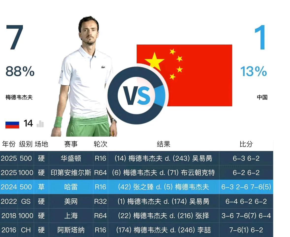 ATP500华盛顿男单第三轮,吴易昺3-6/2-6不敌8号种子梅德韦杰夫无缘八强。 梅德韦杰夫对中国选手7胜1负,唯一一负输给了张之臻。