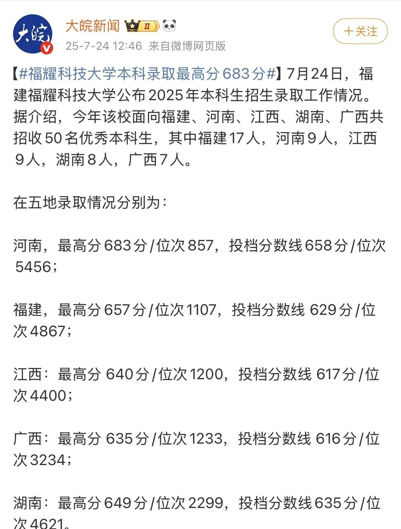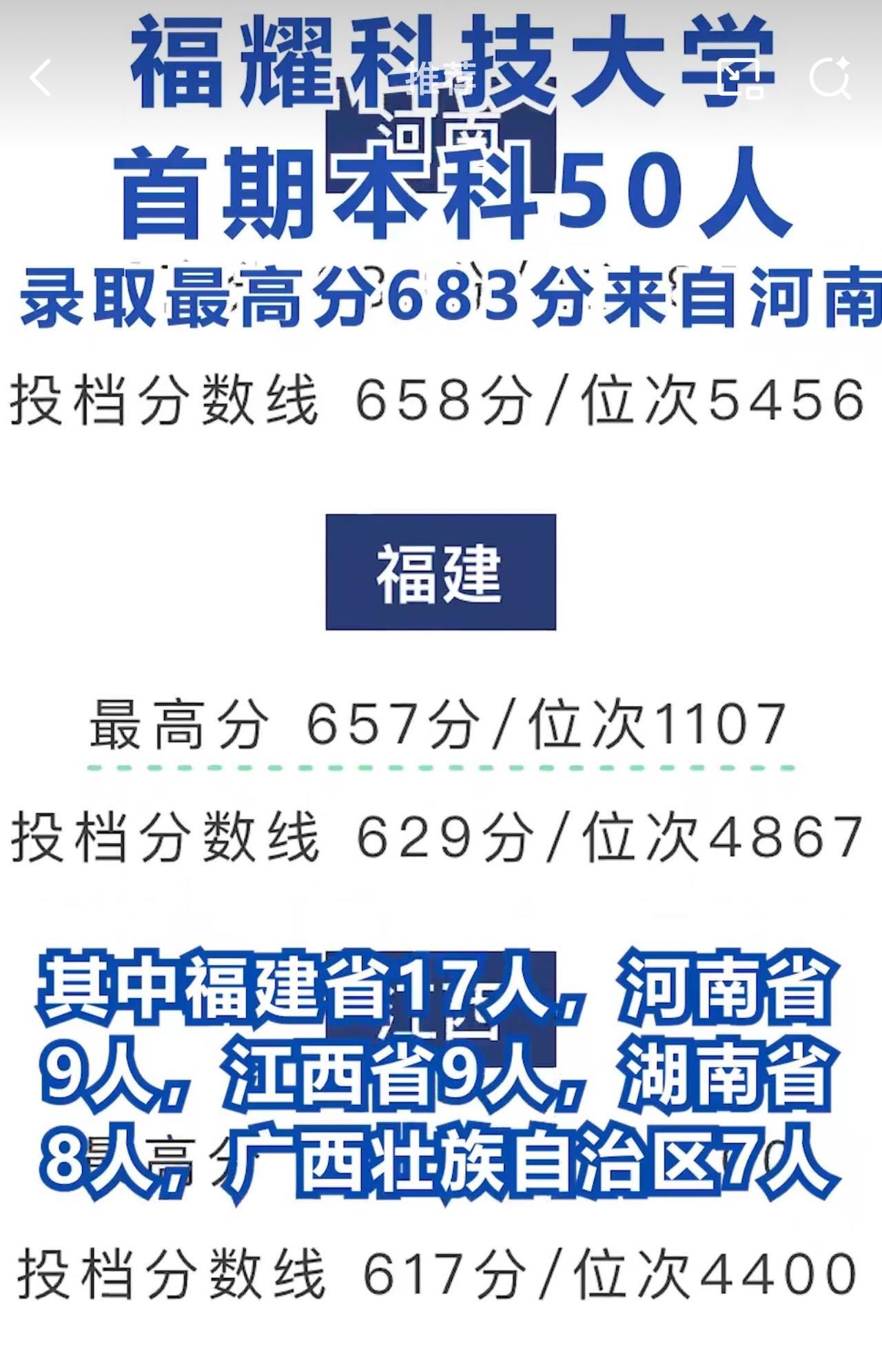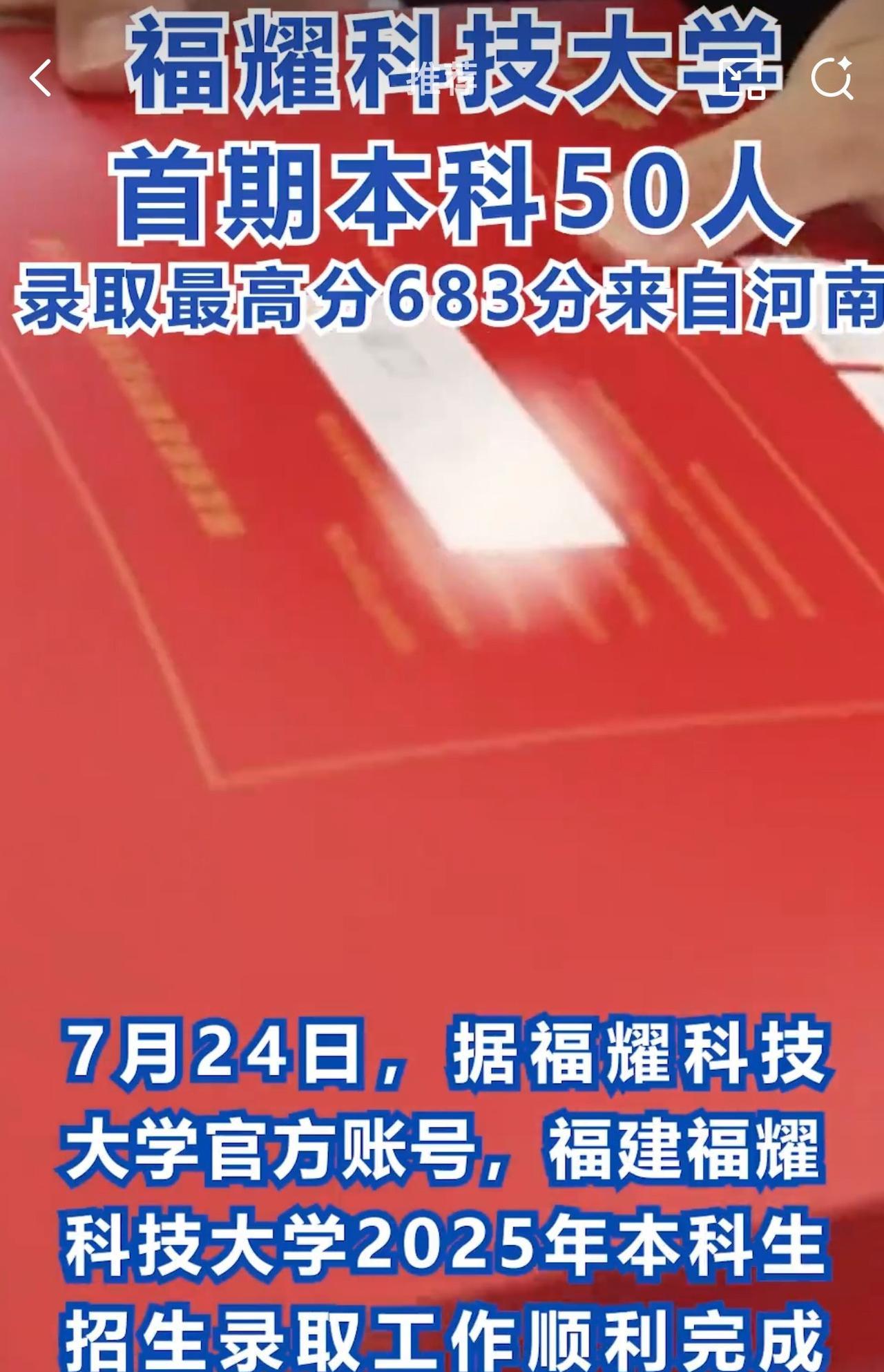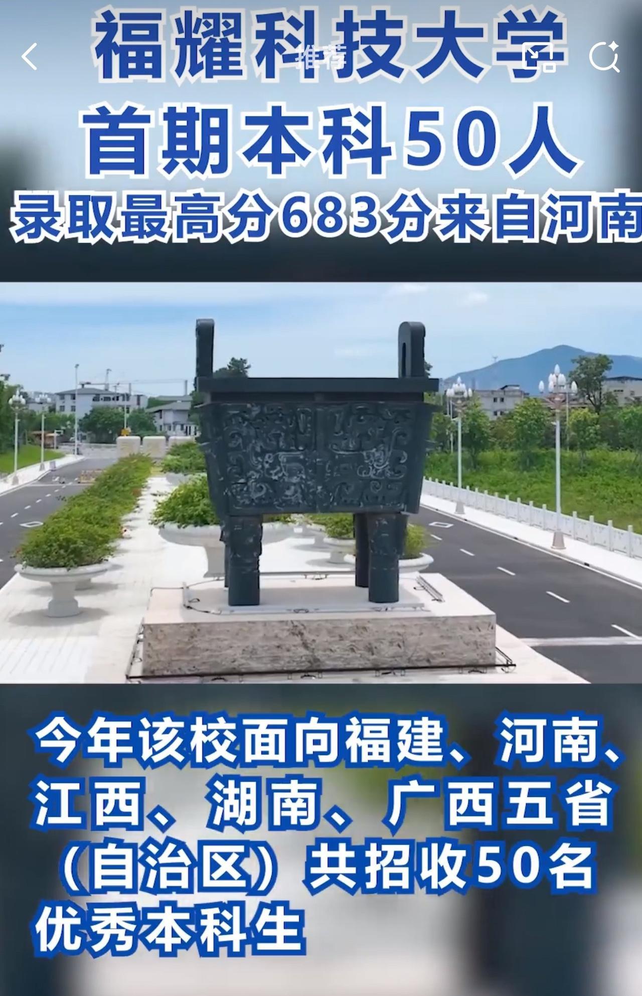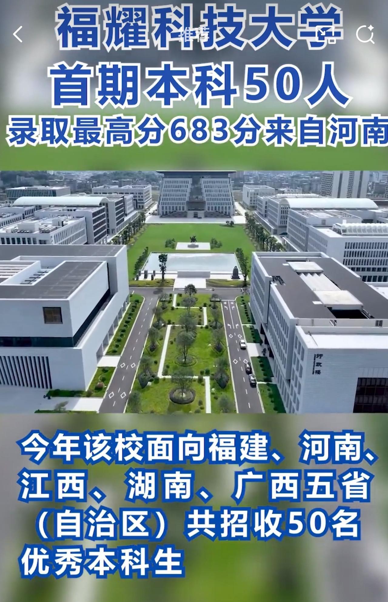 据悉,今年福耀科技大学只面向福建、河南、江西、湖南和广西五省(自治区)公招收50名学生。而那位考生高考683分,该分数可被浙江大学、南京大学等顶尖985高校录取。 此前,不少网友在网上喷福耀科技大学痴人做梦,作为一所民办大学,录取分数竟然要求这么高,50人肯定招不满。 福耀科技大学今年首次招生,就有河南考生以683分的高分报考,这分数都能上不少顶尖985高校了,周少不得不说真挺让人意外! 要知道,福耀科技大学才刚起步,很多人原本都不看好,还质疑这所民办大学的实力和未来发展,觉得痴人做梦。 但从这次招生结果来看,福耀科技大学的吸引力不容小觑。曹德旺出资百亿办学,目标就是培养制造业高端人才,学校不仅有8亿的高额办学预算,6:1的豪华师生比,还有本硕博贯通的培养模式 ,这些条件确实很诱人。 这也说明,学生和家长们在填报志愿时,越来越清醒了,不再只盯着传统名校,更关注学校的教育理念、培养模式和发展潜力。从招满50名来看,着实狠狠回击了喷子,这个笑话看不到了。 对于福耀科技大学今年招满50名学生,大家怎么看呢?它未来能成为顶尖高校吗?#长沙新朋友# #寻美三湘#