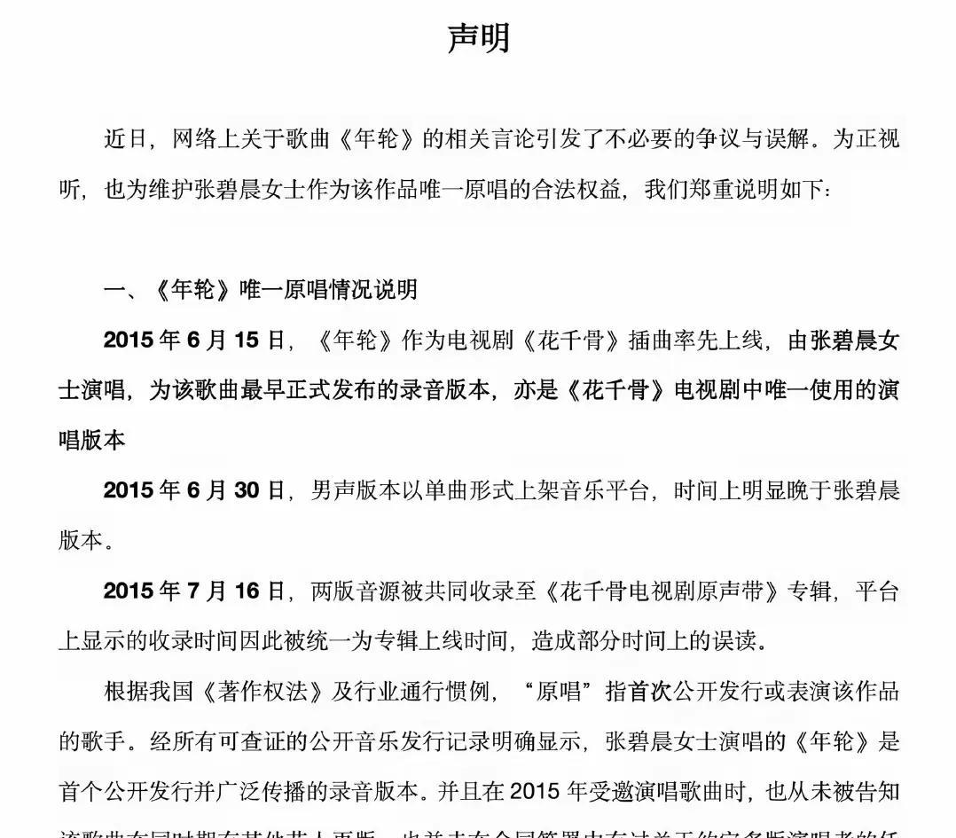 张碧晨再次硬杠汪苏泷,称拥有《年轮》永久演唱权,但不会再唱 在汪苏泷决定收回《年轮》版权之前,他已经给过台阶,双原唱也已经默认。之后李思睿更是甩出邮件,说明事情始末。可不知是张碧晨工作室那里的人情商低,还是一定要辩论清楚,最新发文称拥有永久演唱权,但不会再唱。 这就像小时候唱的那首儿歌“小毛驴”:我有一头小毛驴,却从来也不骑”,真的是租房久了,真把房子当成自己的了。说的那么硬气,就该继续唱才对,怎么还退缩了呢?