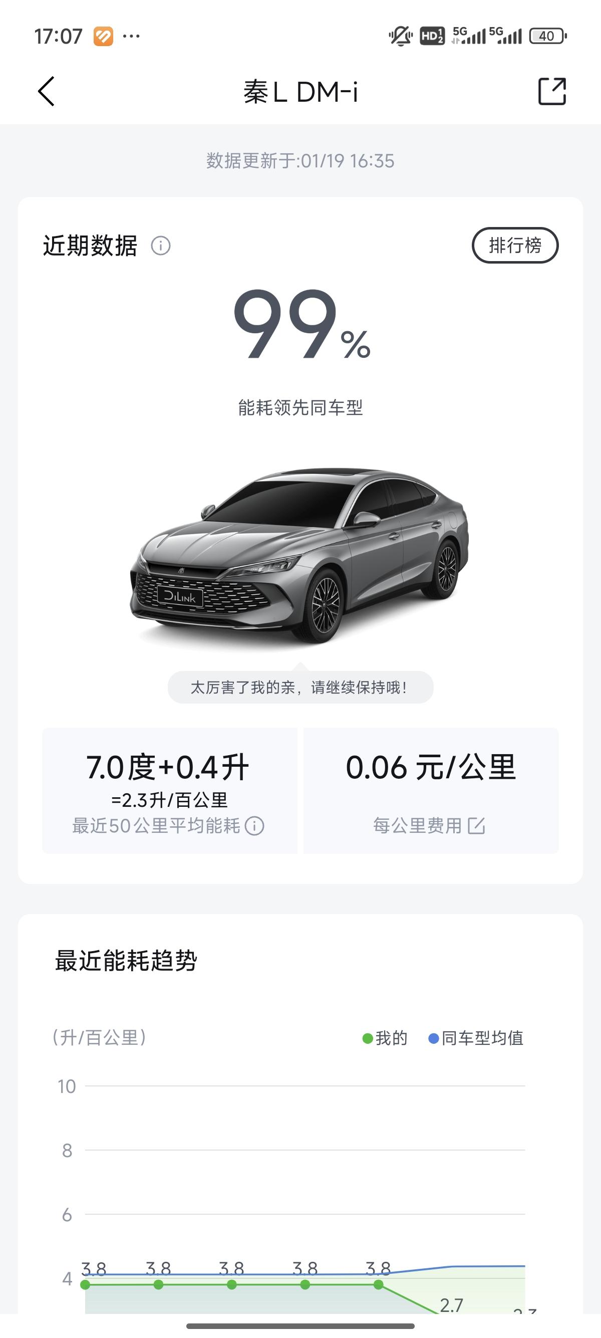 今天这一趟油耗超出我想象,迫不及待分享一下,声明一下,我跟比亚迪没半毛钱关系,也不是书评人,只是买车整三个月(10.19买的),开车经验也只是从这个车开始的经验不足三个月。说下我这趟的路程,下午我从镇安回西安家里(这趟跑了好几遍了),距离大概是125公里左右,我是先在镇安高速口充电站充满电显示120km纯电,然后就是一路纯电,走的是包茂高速,这一路山里90%以上路段都是限速80,我基本按照定速80跑,限速100的我就100定速跑,在山里跑了五六十公里显示剩余纯电只有三四十公里,但是继续跑纯电里程却没下降。等我下高速走上西三环,直到由ev模式变成智能AI的 hev模式跑了117+公里,然后烧油油耗才又慢慢上升一点,117公里的纯电+7公里左右的混动。最终到家油耗显示7.0+0.4升=2.3。整体油耗很满意,尤其是高速表现!!今天高速表显和充电显示纯电比较相符合,我昨天满电经唐都医院和西安国际会展中心然后回家,显示纯满电里程基本和已跑的大概70公里,剩余接近50公里,纯电里程基本就是自己能跑的公里数。不过这种油耗表现真的需要天时地利人和有关。