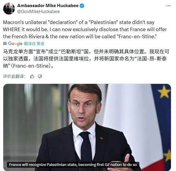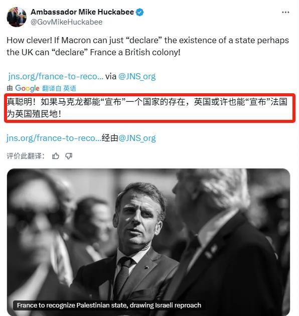在马克龙宣布将承认巴勒斯坦国之后,美国驻以色列大使急了。 7月25日,美国驻以色列大使赫卡比连发两条两条推文抨击马克龙。 1.真聪明,如果马克龙都能“宣布”一个国家的存在,英国或许也能“宣布”法国为英国殖民地! 2.马克龙单方面"宣布"成立"巴勒斯坦"国时未说明其领土位置。现独家披露,法国将提供蔚蓝海岸地区,新国家命名为"法勒斯坦"(法语梗:France+Palestine)。 一个代表美国利益的驻外大使,竟公然帮助以色列讽刺别国元首?要么赫卡比是“精神以色列人”,要么美国的外交政策已沦为以色列的傀儡!