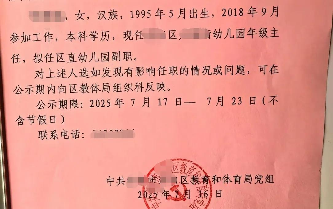 这是一地晋升公示!晋升级别倒是第一次见,与其他晋升公示不同的是,晋升有可能是局长,院长,科长,主任之类。而此人目前职务是幼儿园年级主任,晋升为区直幼儿园副职。也就是说这个幼儿园属于区直单位,不知道这个幼儿园副职属于什么级别呢?副科级还是副股级呢?