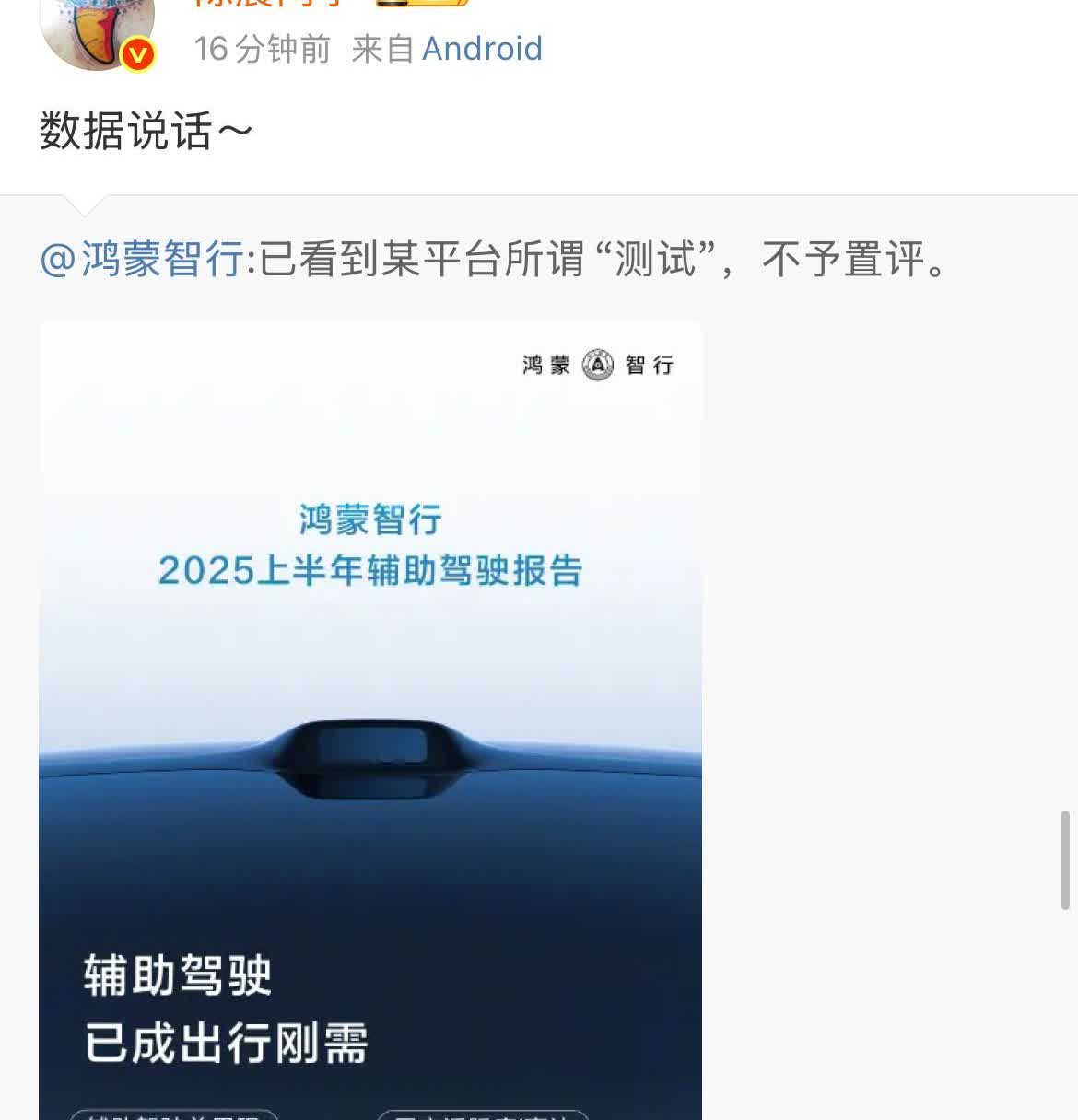 陈震只说了四个字:“数据说话!” 今天上午,鸿蒙智行用不予置评回应了某某平台的所谓测试,陈震在看到鸿蒙智行的这个回应之后,他也只说了这四个字! 因为在这之前,陈震基本上每天都在不断地重复他对这件事情的认识,今天早上他也发文章自己的观点,那是在他的心里面,华为的辅助驾驶就是第一,没有之一! 他认为自己之所以说这种话,是因为鸿蒙智行不但有庞大的用户基础在支撑,而且他也经常在开他们的车,通过长期的对比,他才得出这样的结论! 作为一个汽车头部博主,今天这个事情 ,他已经冲到了热的第一名,他也知道这意味着什么,因此在这个时候他依然坚持自己的观点,可能就不是大家认为的,他被充值的那么简单了,毕竟就像他说的,给他充值的品牌排着队! 而且他也说过,这些品牌之所以这样找他,愿意给他充值的一个关键点,也就在这里,因为不管是好话还是坏话,他说的都是自己的真实体验!并且他愿意为自己说的话负责任。 所以,现在他的评论区才这样热闹,有人同意他的说法,也有人不同意,但就事论事而言,这个事情的结果,可能还需要时间来证明。