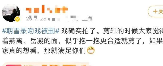 #《朝雪录》吻戏删减引争议 制片人回应:拍了但觉得抱一抱更合适 敖瑞鹏、李兰迪主演的《朝雪录》吻戏被删引发热议,制片人回应称吻戏确实拍了,剪辑时考虑到有燕离、岳凝在场,觉得抱一抱更合适才删减。还表示想看就满足大家,这番回应颇有意思。#制片人回应朝雪录吻戏被删# #敖瑞鹏李兰迪吻戏删减#