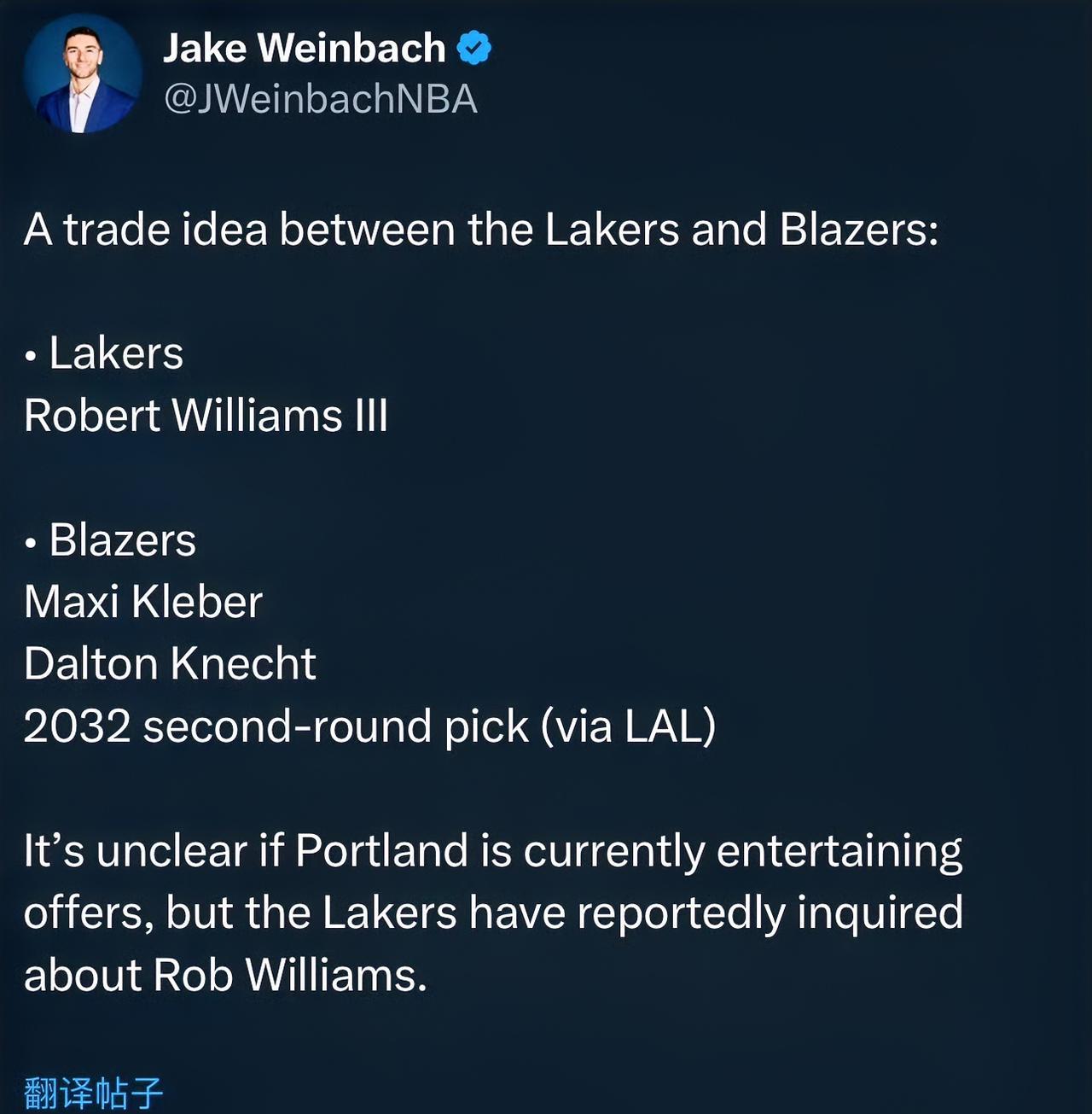 湖人已向开拓者问价罗威! 据NBA记者Jake Weinbach爆料:湖人近期就罗伯特威廉姆斯的潜在交易同开拓者进行了交流,双方可能的交易筹码如下: 湖人得到:罗伯特威廉姆斯! 目前尚不清楚波特兰是否有兴趣接受这份报价,但据最新报道,湖人已经向开拓者询问了罗伯特威廉姆斯。 如果这笔交易能成,湖人在内线就多了一个季后赛能拿的出手的内线,虽然可乐杯是到期合同,但是他拿着1150万的工资,却没什么用,能送走就赶紧送,还有克内克特,这哥们已经废了,无药可救的地步,不打夏季联赛起码还能值个首轮,打完夏联后次轮都不一定值了,所以湖人和开拓者应该好好聊一聊,看能不能促成这笔交易!#NBA# #湖人引援# #湖人# #开拓者# #NBA热点# #NBA吐槽大会#