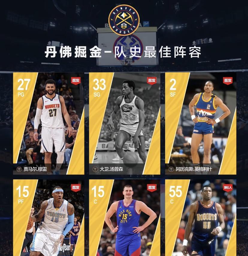 丹佛掘金队史最佳阵容揭晓,这阵容简直绝了! 控球后卫贾马尔 - 穆雷,2016年被掘金第七顺位选中,投篮和三分都超棒,得分手段多样。20 - 21赛季大伤,22 - 23赛季复出依旧神勇,季后赛场均26.1分,总决赛也有场均21.4分,助球队夺首冠,效力至今场均17.8分。 得分后卫大卫 - 汤普森,身体素质炸裂,“天行者”绰号可不是白来的,快攻、突破和中距离跳投都强。1976 - 1982年效力,场均23.7分,4次全明星、2次最佳阵容,33号球衣退役,还入选名人堂。 小前锋阿历克斯 - 英格利什得分能力超强。约基奇,安东尼贡献自己的力量。