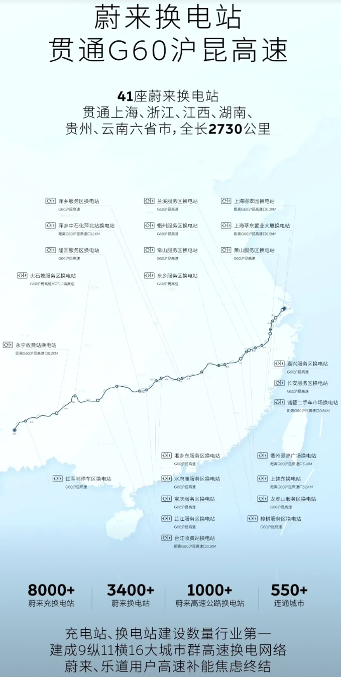 李斌展示高速换电站第四天 G60沪昆高速,全长2730公里,全程41座换电站。 21年11月29日,完成高速换电站布局了。 如果不是李斌的微博,我也不了解这条高速,没用的知识又增加了。