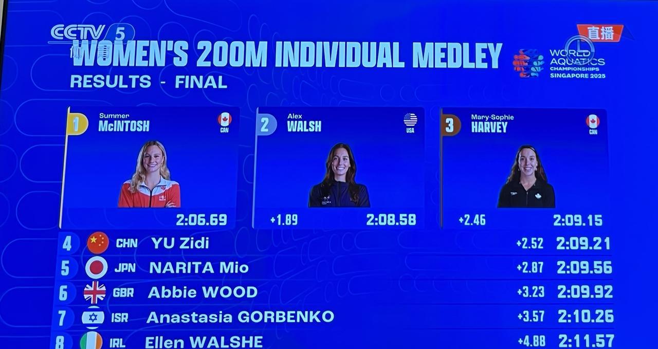 2025年世界泳联锦标赛(2025 World Aquatics Championships),包括花样游泳、水球、公开水域游泳、跳水、游泳等五个水上运动项目,于2025年7月11日至8月3日在新加坡举行。其中游泳项目在7月27日至8月3日进行。今天,覃海洋获得100米蛙泳金牌,为中国队拿到首金,也为其在巴黎奥运会上不利表现而正名。另外,最大的惊喜来自一位12岁的女孩——于子迪,她是年龄最小的游泳运动员,也是第一次参加国际大赛,她在200米个人混合泳决赛中以2分09秒21获得第四名的优异成绩,与第三名仅差0.06秒。在“蝶仰蛙自”四个混合项目中,前两个冲到第三,蛙泳掉到第七,自由泳又冲到第四,比赛异常激烈,遗憾未能冲上领奖台,但小小年纪一鸣惊人,未来可期!