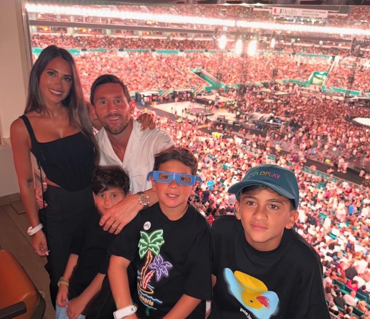 ??? 梅西及其家人现身迈阿密酷玩乐队的音乐会。 北京时间7月28日,安东内拉于社交媒体晒出梅西一家五口观看酷玩乐队迈阿密演唱会的照片。当地时间7月27日,酷玩乐队在迈阿密硬石体育场开唱,梅西携家人前往享受音乐。 现场极为疯狂,梅西一出现,全场观众瞬间沸腾,欢呼声几乎要掀翻体育场。