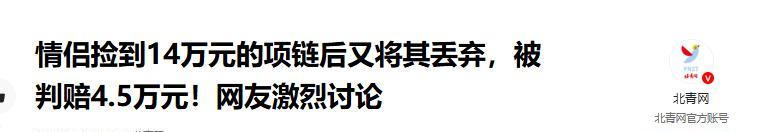 上海一男子,和女友逛商场,捡到一条价值14万的金项链。男子趁没人看见,赶紧装兜里。第二天,失主报警,没想到男子却说,他以为那条项链是假的,扔了。失主勃然大怒,要求男子赔14万。男子认为失主在敲诈,于是两人闹到法院! 根据北青网报道,事情发生在2023年10月。男子小林带着自己的女朋友去商场逛街,想着家里有些必需品不够用了,来超市买一些,在看看有什么好看的合适的衣服,相中了可以入手。 就在他们坐扶梯上3楼的时候,发现了一条金灿灿的黄金项链!男子的第一反应不是谁掉的项链,而是环顾四周看看有没有人,一看没有人在寻找项链,也没有人经过,立马蹲下来装做系鞋带,然后把项链放进口袋里。 当时他的女友看见项链后,眼睛都亮了,想着这个项链很重,估计得有十几二十克那样,如果是真的话那可就赚大发了,但是他们不确定捡到的黄金项链是不是真的,反正表面是黄色的。 与此同时,丢项链的小贾慌了神。项链是他在2022年入手的,当时还专门找人定做的,一共花了142400元。这条项链对小贾来说很特殊,是他努力工作很久,攒了很多钱买的,也算是变相存钱了。自从项链入手后,一直带在身上,没有丢过,也没有取下来过。 可在事发当天,小贾和朋友约在商场吃饭,结果经过3楼的时候,项链掉了。小贾那时候没有注意项链掉了,后来才发现脖子上的项链没了。但是他当天去了很多地方,也不知道项链是在什么时候丢了,掉哪里了,有没有被人捡走。 虽然找回的概率不是很大,但小贾还是不肯放弃,立马报警,希望民警帮忙找找,毕竟项链的价格不便宜,花了很多钱,如果真的找到,不管是谁捡到的,小贾都觉得自己要重谢这个好心人。 在民警的一番调查后,锁定了小林是捡走项链的人。民警联系小林,让他到派出所做笔录,那时候,小林告诉民警他和女友看见项链是黄金的,就以为是真的,然后顺走了。 不过,小林称这个项链扔了,扔在小区的草坪上。他们觉得项链虽然是黄色的,像是黄金,但觉得不值钱,就给扔了...... 当小贾听到这个解释后觉得特别可笑,像是假的?给扔了?说出来谁会信!小贾不知道是小林私藏了不想归还,还是真的扔了,但小林捡到项链没有想着归还,而是拿走了,这一点他就不对,所以小贾要求小林赔偿项链。 可小林觉得自己扔了,又没有拿凭什么要赔偿?如果自己拿了,可以赔偿,但眼下项链也不再自己手里,让小贾自己去小区草坪上找! 小贾觉得小林说的话特别可笑,为了拿回属于自己的项链,为了让小林赔偿,小贾将他告上法庭。法院在审理后认为,小林和自己的女朋友没有保管好项链,需要负责,赔偿小贾45000元! 这件事发生后,有人觉得小林说的话不可信。一般情况下捡到这种金属东西不管真假,短时间内是不会扔掉的,想占为己有才是真的! 那么,你们觉得小林是自己留下来了,还是扔了?