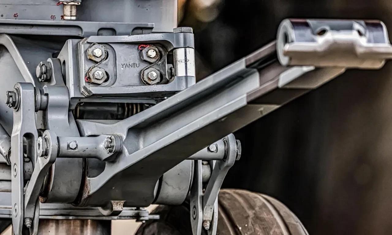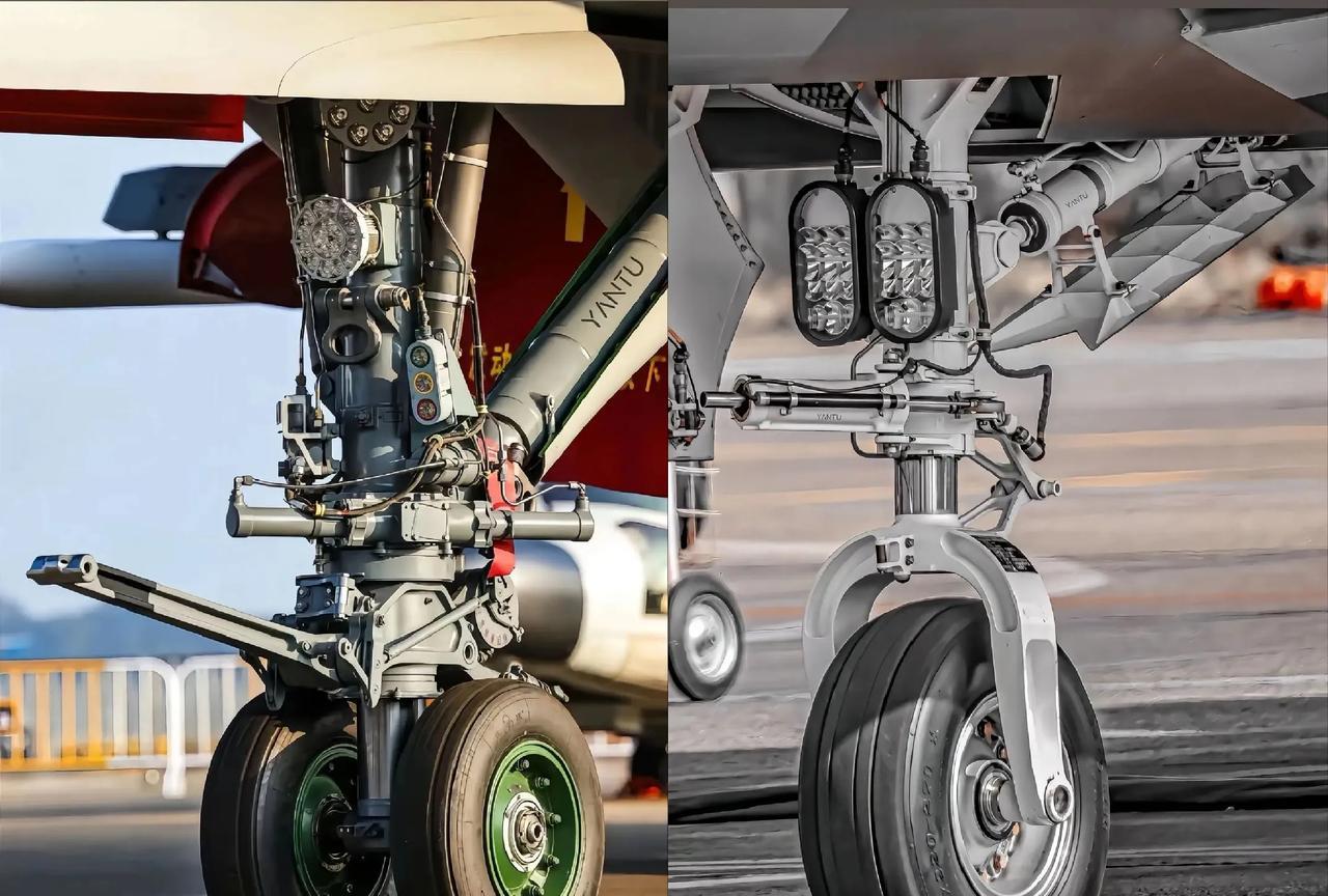 来看看歼-15T的前起落架,又粗又壮,充满了独立自主的工业美感! 歼-15T毕竟是重型机,还是电磁弹射型,可以看到前面加装了弹射牵引杆,可以配合电磁弹射系统,把一架30多吨重的重型战斗机在几秒内加速到起飞速度(至少260公里/小时)! 所以这玩意不结实不行,而且不仅仅是弹射起飞,就是在降落的时候,前起落架也需要承受极端的冲击,对材料学、精密制造以及结构力学有着很高的要求!