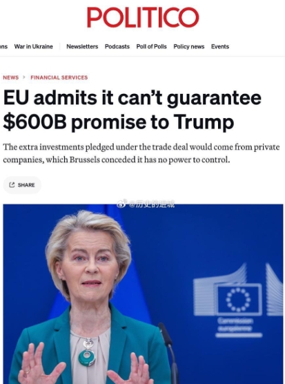 .冯德莱恩在苏格兰对着特朗普承诺,说欧盟要给美国投 6000 亿美元,结果话音刚落没几小时,布鲁塞尔那边就急着拆台 —— 俩欧盟委员会的高官跳出来说,她根本没这权力许诺,钱得靠欧洲私企自己掏,公共投资一分没有,“欧盟作为官方可保证不了,全看私企乐意不乐意”。