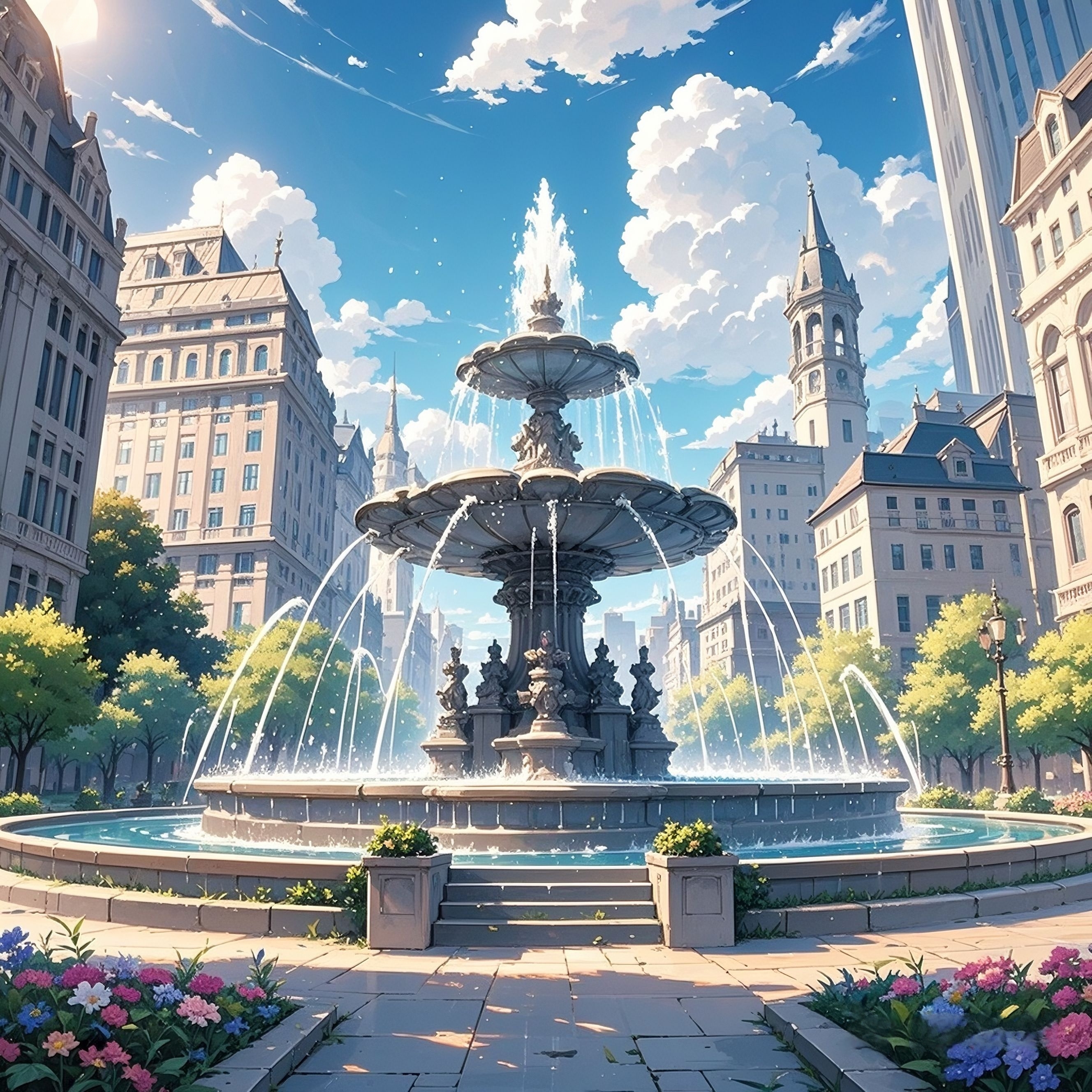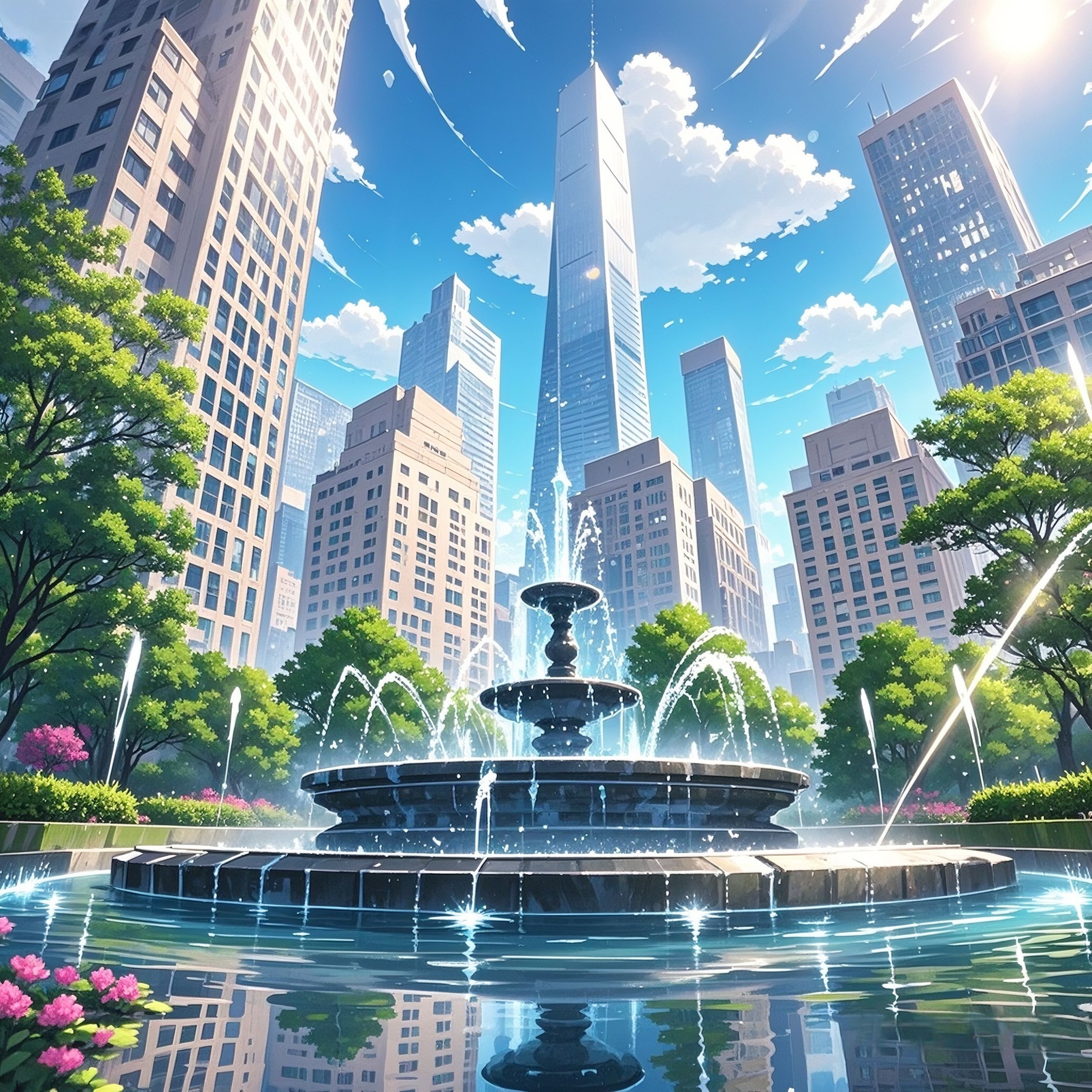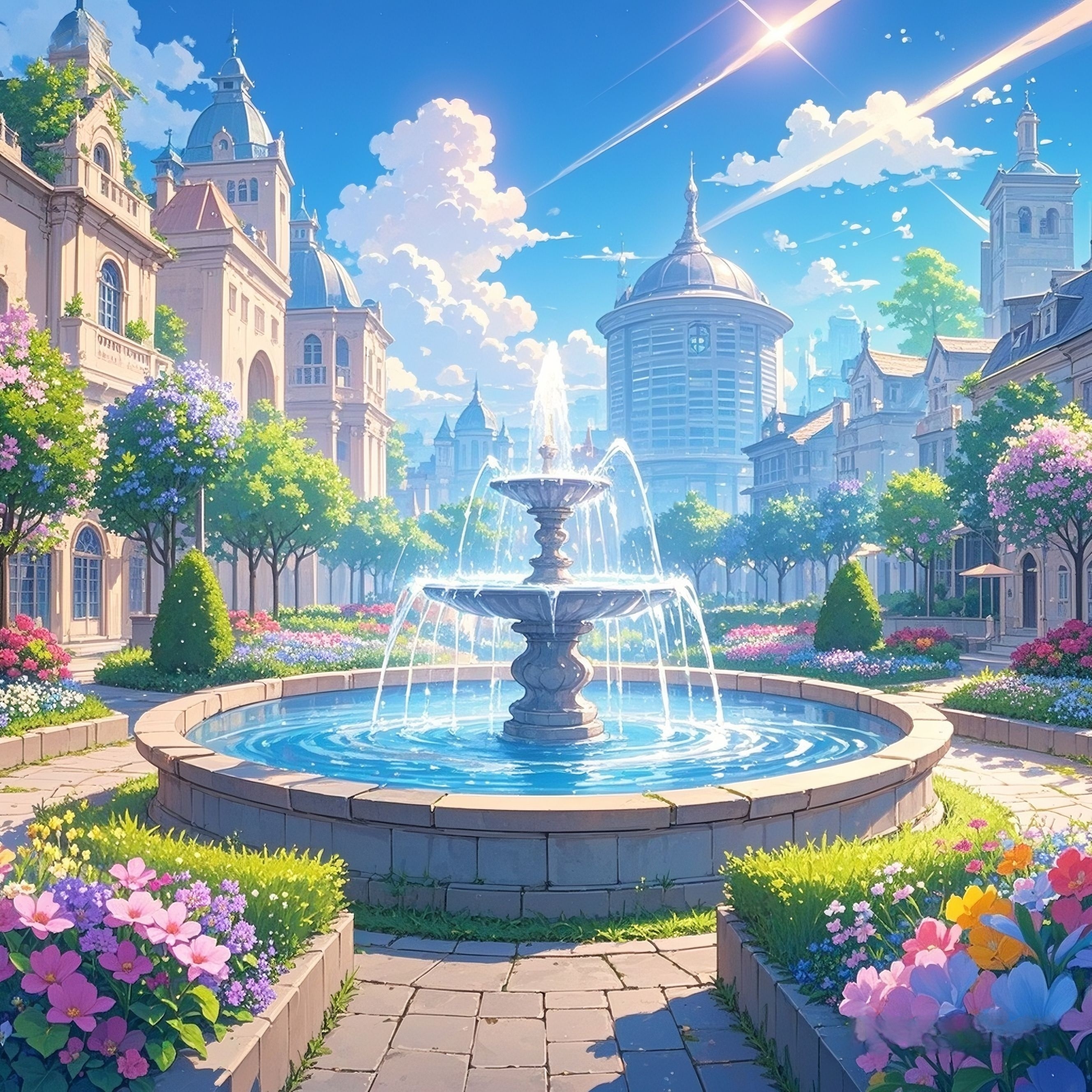 喷泉静止的刹那,水珠凝成浮空的星座,每一滴水都囚着半片天空的蓝。
