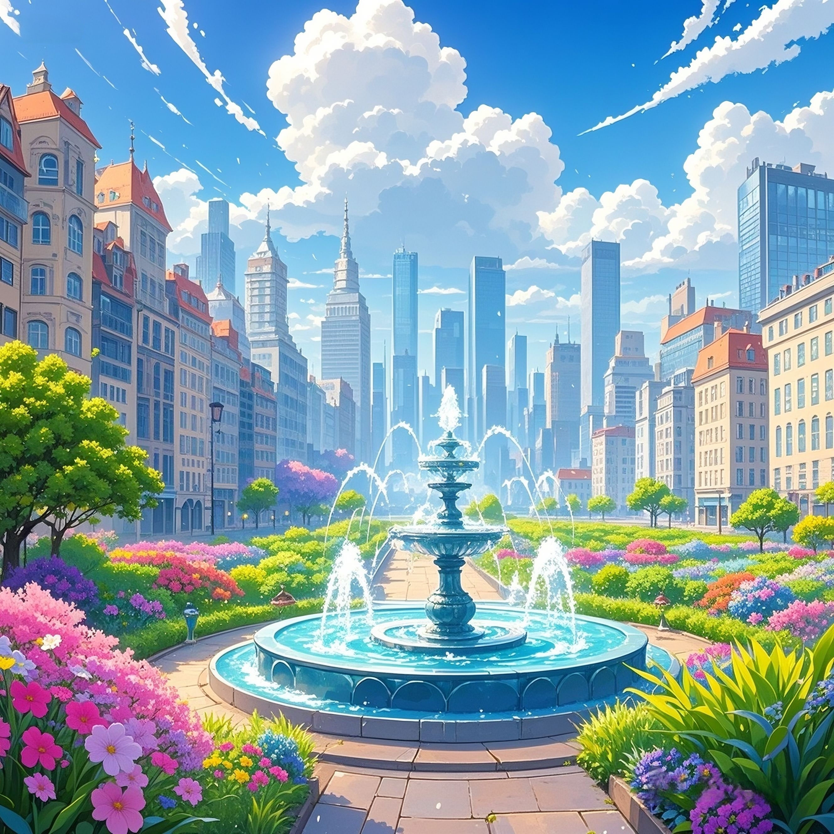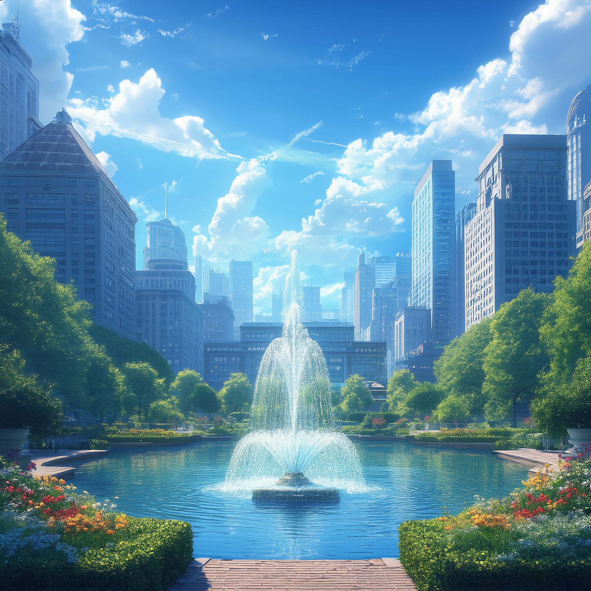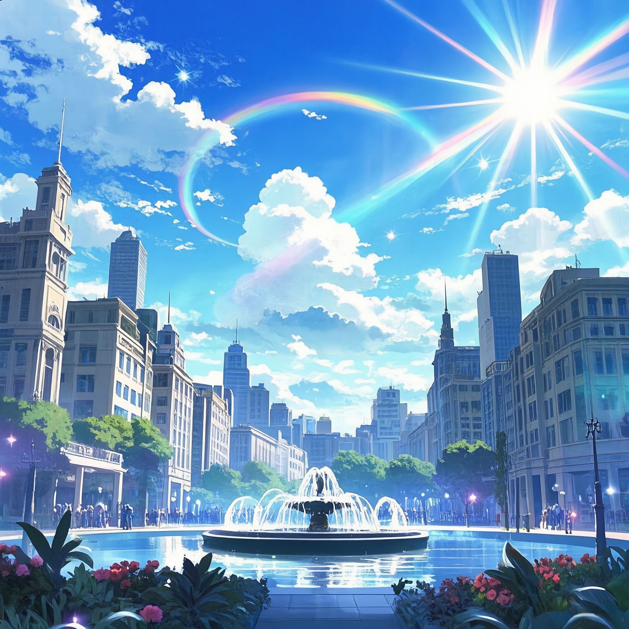 喷泉静止的刹那,水珠凝成浮空的星座,每一滴水都囚着半片天空的蓝。