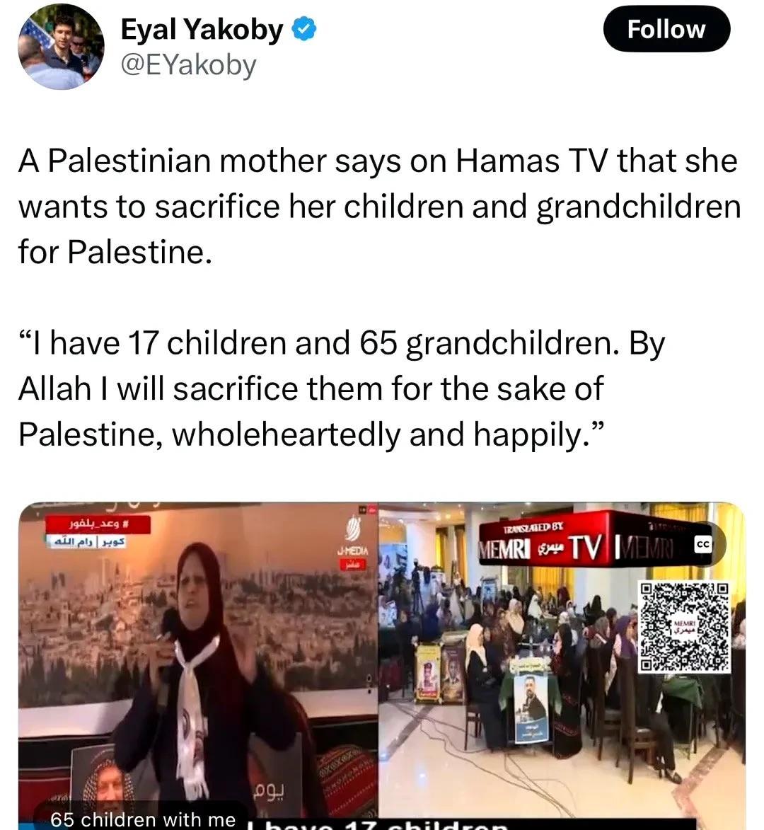 一个巴勒斯坦妇女说,她有17个孩子,65个孙子,她愿意孩子们为巴勒斯坦献出生命。