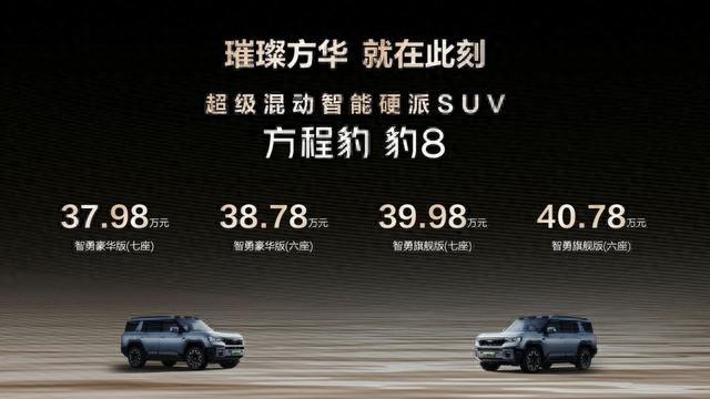 11月12日,比亚迪方程豹豹8上市,37.98万起售,顶配40.78万。问界M9同款华为高阶智驾ADS3.0,腾势Z9同款DiLink 150座舱,仰望U8同款全功能云辇-P液压悬架,方程豹专属DMO电驱越野平台,方程豹豹8集齐四大顶尖黑科技,出手即是王炸。
