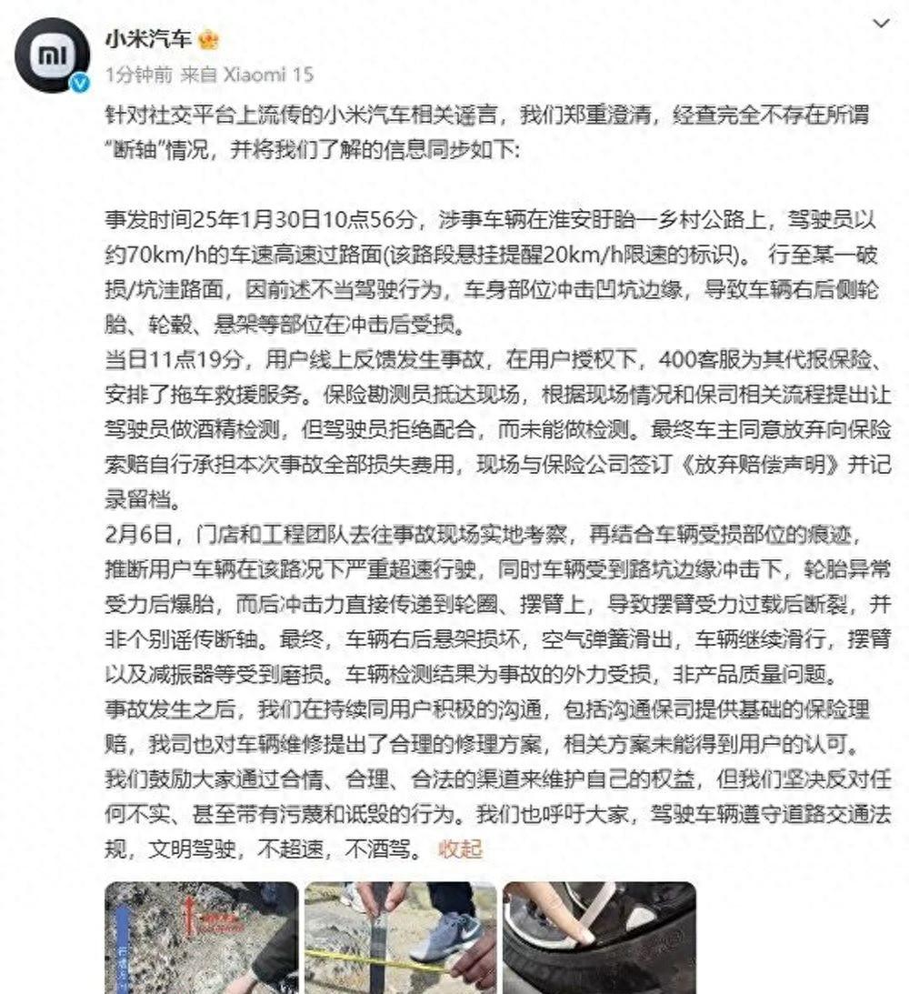 让我们先回到事件的起点。2025年1月30日,一位车主驾驶着他的小米SU7行驶在淮安盱眙一条限速20km/h的乡村公路上。然而,他并没有遵守限速规定,而是以70km/h的速度飞驰,最终在经过一段坑洼路面时,车辆右后侧轮胎、轮毂、悬架等部位受损。事故发生后,车主第一时间联系了小米客服,客服迅速安排了拖车救援和保险理赔服务。然而,在保险公司要求进行酒精测试时,车主却拒绝配合。 这无疑给事件蒙上了一层阴影,也让“断轴”的说法更加扑朔迷离。
